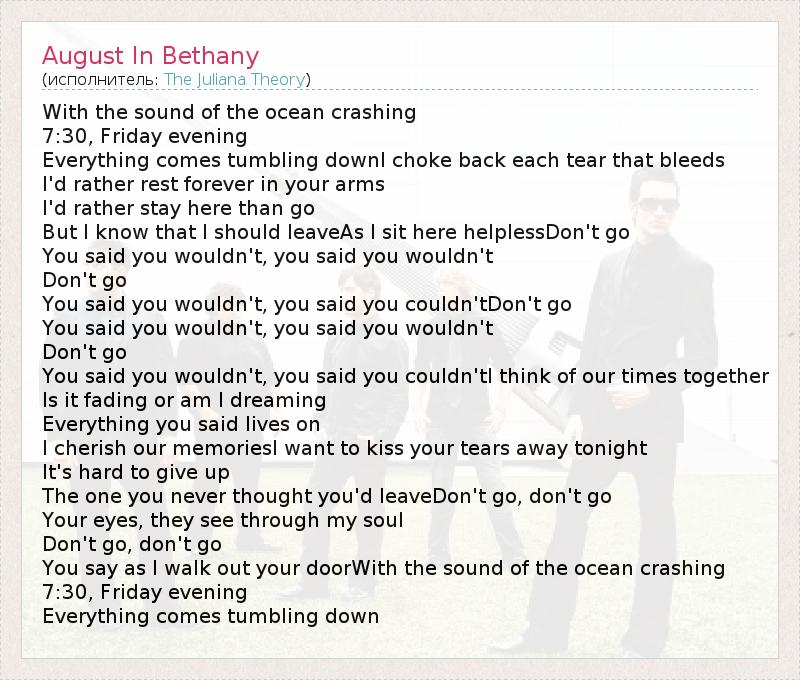 А как ты думаешь, о чем песня "August In Bethany" ?