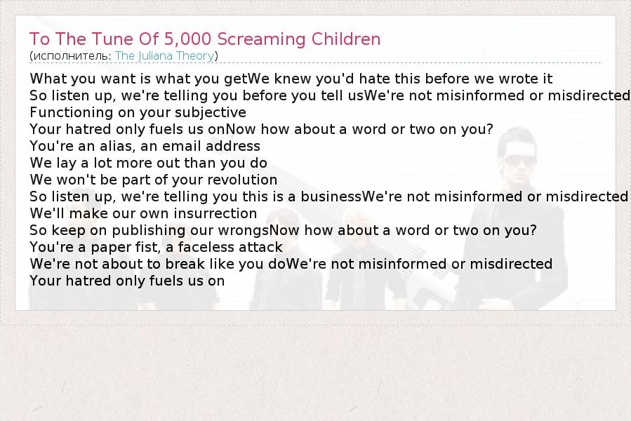 ГлавнаяИсполнителиThe Juliana TheoryTo The Tune Of 5,000 Screaming Children
