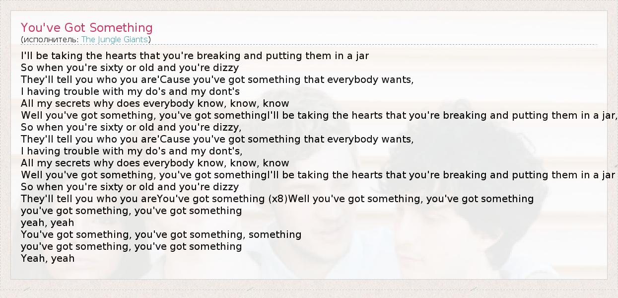 I'll be taking the hearts that you're breaking and putting them in a jar So when you're sixty or old and you're dizzy They'll tell you who you are'Cause you've got something that everybody wants, I having trouble with my do's and my dont's All my secrets why does everybody know, know, know Well you've got something, you've got somethingI'll be taking the hearts that you're breaking and putting them in a jar, So when you're sixty or old and you're dizzy, They'll tell you who you are'Cause you've got something that everybody wants, I having trouble with my do's and my dont's, All my secrets why does everybody know, know, know Well you've got something, you've got somethingI'll be taking the hearts that you're breaking and putting them in a jar So when you're sixty or old and you're dizzy They'll tell you who you areYou've got something (x8)Well you've got something, you've got something you've got something, you've got something yeah, yeah You've got something, you've got something, something you've got something, you've got something Yeah, yeah