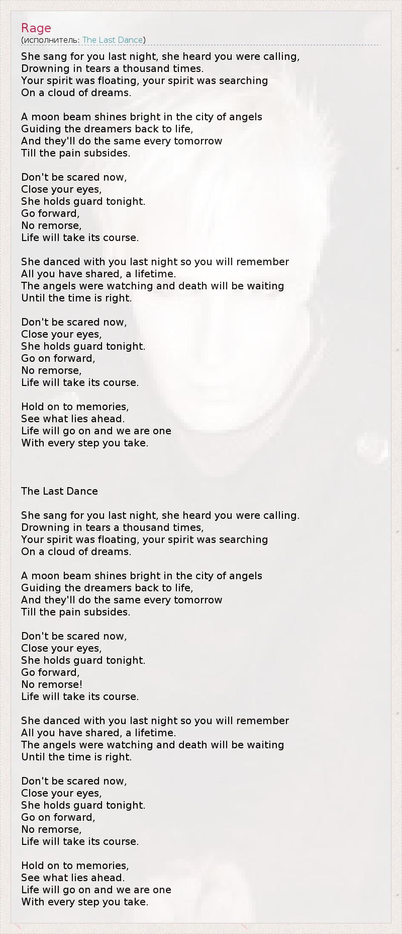 Она пела для тебя прошлой ночью, она услышала твой зов, Проливая потоки слёз тысячи раз, Твой дух парил, твой дух искал На облаке снов. Лунный луч ярко озарил город ангелов, Возвращая мечтателей из грёз обратно в жизнь. И они будут делать так каждый раз, Пока не утихнет их боль. А сейчас не бойся, Закрой глаза, Сегодня вечером она охраняет тебя. Иди вперёд, Без сожалений, Жизнь направит тебя. Ты будешь помнить ваш танец с ней прошлой ночью, Вы разделите между собой целую жизнь. Ангелы за вами наблюдают, а смерть ожидает, Пока не придёт её час. А сейчас не бойся, Закрой глаза, Сегодня вечером она охраняет тебя. Иди вперёд, Без сожалений, Жизнь направит тебя. Храни эти воспоминания, Загляни в будущее. Жизнь продолжается, и мы с тобой Каждый шаг сделаем вместе. Последний танец (перевод Ярослав из Москвы) Она пела для тебя прошлой ночью, она слышала, как ты звал её, Утопая в слезах тысячи раз, Твой дух парил, твой дух искал На облаке мечтаний. Лунный свет ярко сияет в городе ангелов, Отводя мечтателей обратно к жизни. И они станут делать то же каждый день, Покуда боль не утихнет. Не бойся теперь Закрой свои глаза, Она задержит сегодня охрану. Вперёд, Никакого раскаяния! Жизнь пойдёт своим чередом. Она танцевала с тобой прошлой ночью, так что ты запомнишь, Что вы разделили всю жизнь. Ангелы засматривались, и смерть подождёт Своего часа. Не бойся теперь Закрой свои глаза, Она задержит сегодня охрану. Вперёд, Никакого раскаяния! Жизнь пойдёт своим чередом. Держитесь воспоминаний, Смотря вперёд. Жизнь продолжится, и мы - одно целое С каждым твоим шагом.