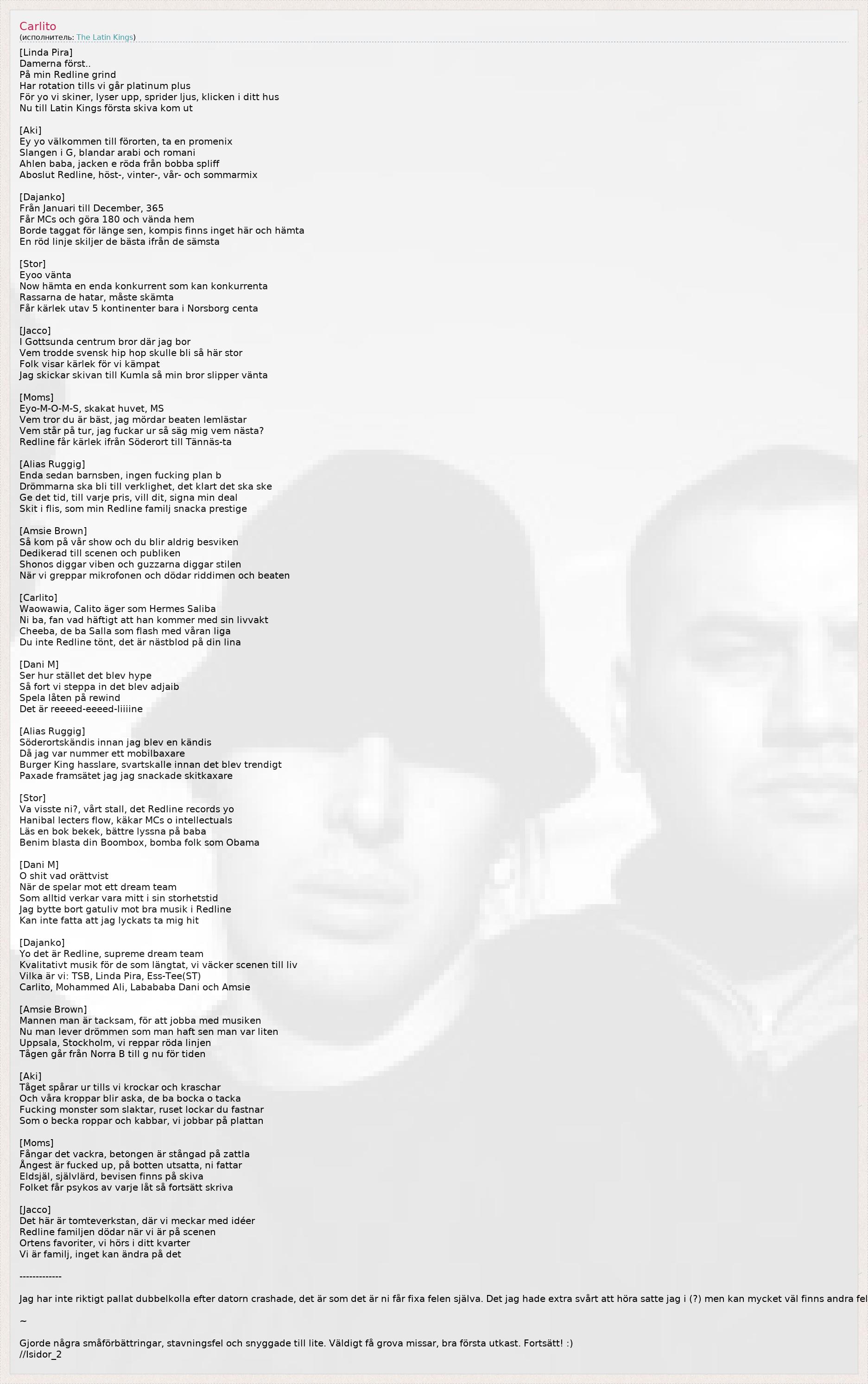 [Linda Pira] Damerna först.. På min Redline grind Har rotation tills vi går platinum plus För yo vi skiner, lyser upp, sprider ljus, klicken i ditt hus Nu till Latin Kings första skiva kom ut [Aki] Ey yo välkommen till förorten, ta en promenix Slangen i G, blandar arabi och romani Ahlen baba, jacken e röda från bobba spliff Aboslut Redline, höst-, vinter-, vår- och sommarmix [Dajanko] Från Januari till December, 365 Får MCs och göra 180 och vända hem Borde taggat för länge sen, kompis finns inget här och hämta En röd linje skiljer de bästa ifrån de sämsta [Stor] Eyoo vänta Now hämta en enda konkurrent som kan konkurrenta Rassarna de hatar, måste skämta Får kärlek utav 5 kontinenter bara i Norsborg centa [Jacco] I Gottsunda centrum bror där jag bor Vem trodde svensk hip hop skulle bli så här stor Folk visar kärlek för vi kämpat Jag skickar skivan till Kumla så min bror slipper vänta [Moms] Eyo-M-O-M-S, skakat huvet, MS Vem tror du är bäst, jag mördar beaten lemlästar Vem står på tur, jag fuckar ur så säg mig vem nästa? Redline får kärlek ifrån Söderort till Tännäs-ta [Alias Ruggig] Enda sedan barnsben, ingen fucking plan b Drömmarna ska bli till verklighet, det klart det ska ske Ge det tid, till varje pris, vill dit, signa min deal Skit i flis, som min Redline familj snacka prestige [Amsie Brown] Så kom på vår show och du blir aldrig besviken Dedikerad till scenen och publiken Shonos diggar viben och guzzarna diggar stilen När vi greppar mikrofonen och dödar riddimen och beaten [Carlito] Waowawia, Calito äger som Hermes Saliba Ni ba, fan vad häftigt att han kommer med sin livvakt Cheeba, de ba Salla som flash med våran liga Du inte Redline tönt, det är nästblod på din lina [Dani M] Ser hur stället det blev hype Så fort vi steppa in det blev adjaib Spela låten på rewind Det är reeeed-eeeed-liiiine [Alias Ruggig] Söderortskändis innan jag blev en kändis Då jag var nummer ett mobilbaxare Burger King hasslare, svartskalle innan det blev trendigt Paxade framsätet jag jag snackade skitkaxare [Stor] Va visste ni?, vårt stall, det Redline records yo Hanibal lecters flow, käkar MCs o intellectuals Läs en bok bekek, bättre lyssna på baba Benim blasta din Boombox, bomba folk som Obama [Dani M] O shit vad orättvist När de spelar mot ett dream team Som alltid verkar vara mitt i sin storhetstid Jag bytte bort gatuliv mot bra musik i Redline Kan inte fatta att jag lyckats ta mig hit [Dajanko] Yo det är Redline, supreme dream team Kvalitativt musik för de som längtat, vi väcker scenen till liv Vilka är vi: TSB, Linda Pira, Ess-Tee(ST) Carlito, Mohammed Ali, Labababa Dani och Amsie [Amsie Brown] Mannen man är tacksam, för att jobba med musiken Nu man lever drömmen som man haft sen man var liten Uppsala, Stockholm, vi reppar röda linjen Tågen går från Norra B till g nu för tiden [Aki] Tåget spårar ur tills vi krockar och kraschar Och våra kroppar blir aska, de ba bocka o tacka Fucking monster som slaktar, ruset lockar du fastnar Som o becka roppar och kabbar, vi jobbar på plattan [Moms] Fångar det vackra, betongen är stångad på zattla Ångest är fucked up, på botten utsatta, ni fattar Eldsjäl, självlärd, bevisen finns på skiva Folket får psykos av varje låt så fortsätt skriva [Jacco] Det här är tomteverkstan, där vi meckar med idéer Redline familjen dödar när vi är på scenen Ortens favoriter, vi hörs i ditt kvarter Vi är familj, inget kan ändra på det ------------- Jag har inte riktigt pallat dubbelkolla efter datorn crashade, det är som det är ni får fixa felen själva. Det jag hade extra svårt att höra satte jag i (?) men kan mycket väl finns andra fel ~ Gjorde några småförbättringar, stavningsfel och snyggade till lite. Väldigt få grova missar, bra första utkast. Fortsätt! :) //Isidor_2