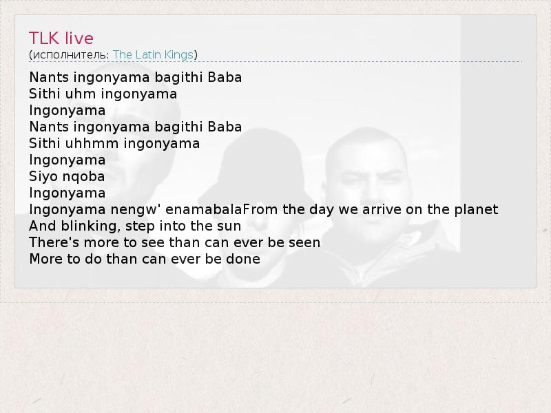 Nants ingonyama bagithi Baba Sithi uhm ingonyama Ingonyama Nants ingonyama bagithi Baba Sithi uhhmm ingonyama Ingonyama Siyo nqoba Ingonyama Ingonyama nengw' enamabalaFrom the day we arrive on the planet And blinking, step into the sun There's more to see than can ever be seen More to do than can ever be done