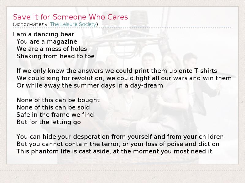 А как ты думаешь, о чем песня "Save It for Someone Who Cares" ?