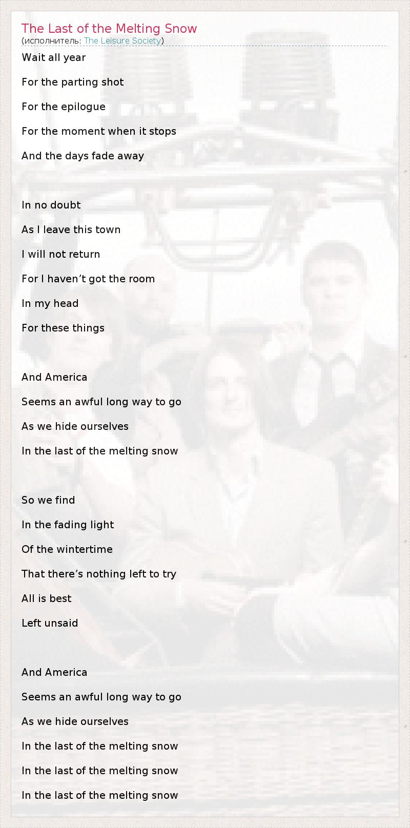Wait all year For the parting shot For the epilogue For the moment when it stops And the days fade away In no doubt As I leave this town I will not return For I haven’t got the room In my head For these things And America Seems an awful long way to go As we hide ourselves In the last of the melting snow So we find In the fading light Of the wintertime That there’s nothing left to try All is best Left unsaid And America Seems an awful long way to go As we hide ourselves In the last of the melting snow In the last of the melting snow In the last of the melting snow