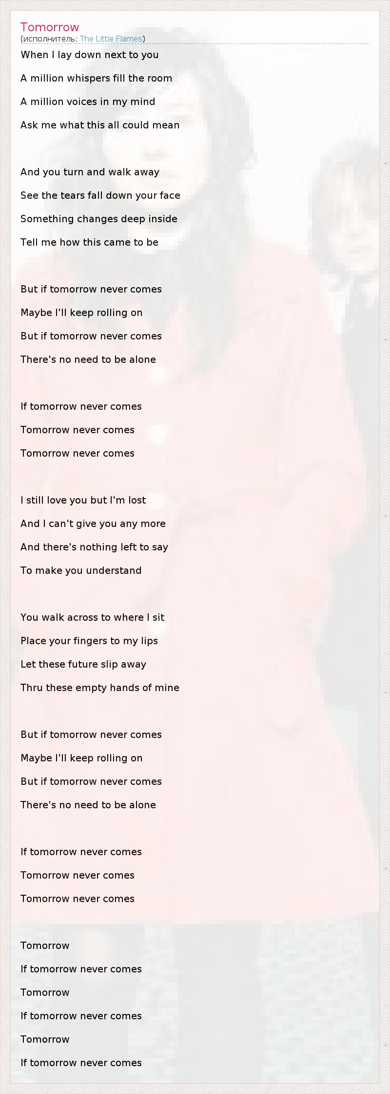 When I lay down next to you A million whispers fill the room A million voices in my mind Ask me what this all could mean And you turn and walk away See the tears fall down your face Something changes deep inside Tell me how this came to be But if tomorrow never comes Maybe I'll keep rolling on But if tomorrow never comes There's no need to be alone If tomorrow never comes Tomorrow never comes Tomorrow never comes I still love you but I'm lost And I can't give you any more And there's nothing left to say To make you understand You walk across to where I sit Place your fingers to my lips Let these future slip away Thru these empty hands of mine But if tomorrow never comes Maybe I'll keep rolling on But if tomorrow never comes There's no need to be alone If tomorrow never comes Tomorrow never comes Tomorrow never comes Tomorrow If tomorrow never comes Tomorrow If tomorrow never comes Tomorrow If tomorrow never comes