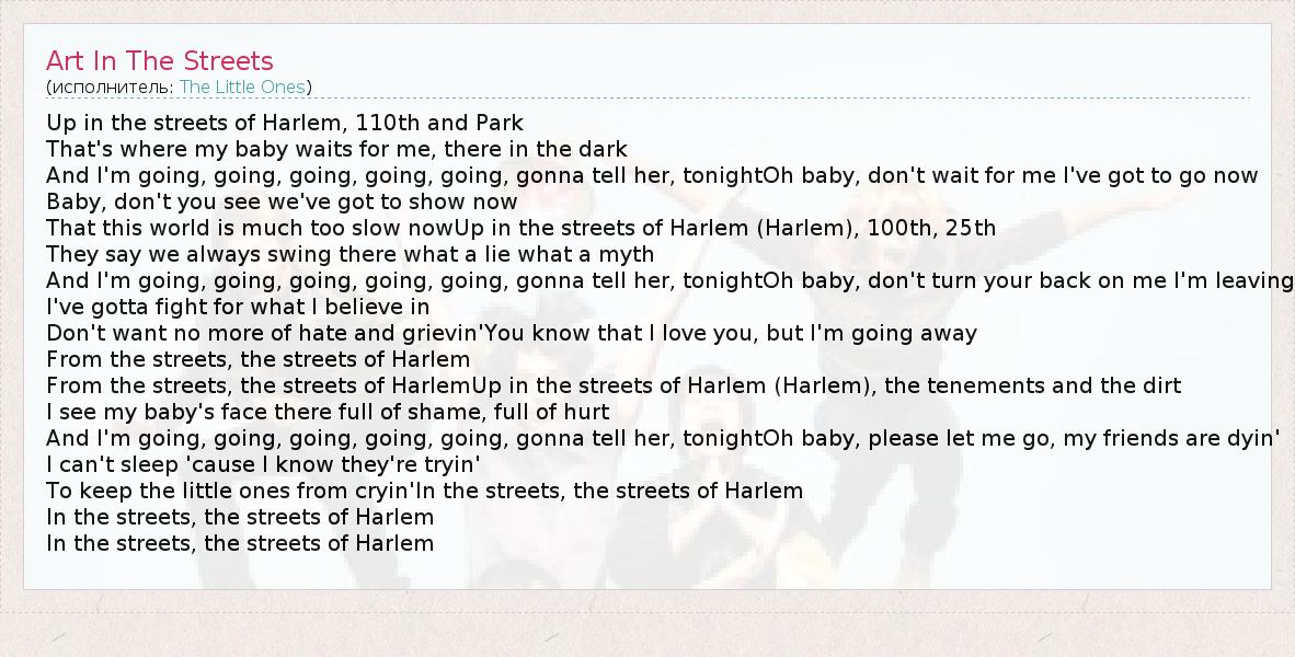 To keep the little ones from cryin'In the streets, the streets of Harlem