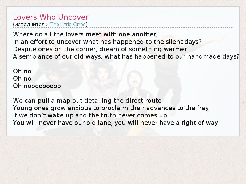 А как ты думаешь, о чем песня "Lovers Who Uncover" ?