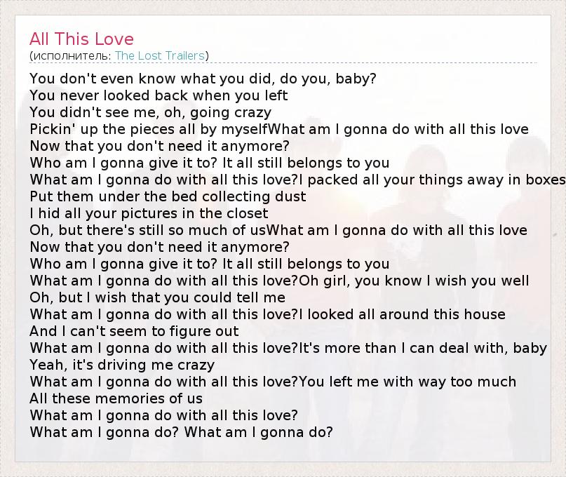 You don't even know what you did, do you, baby? You never looked back when you left You didn't see me, oh, going crazy Pickin' up the pieces all by myselfWhat am I gonna do with all this love Now that you don't need it anymore? Who am I gonna give it to? It all still belongs to you What am I gonna do with all this love?I packed all your things away in boxes Put them under the bed collecting dust I hid all your pictures in the closet Oh, but there's still so much of usWhat am I gonna do with all this love Now that you don't need it anymore? Who am I gonna give it to? It all still belongs to you What am I gonna do with all this love?Oh girl, you know I wish you well Oh, but I wish that you could tell me What am I gonna do with all this love?I looked all around this house And I can't seem to figure out What am I gonna do with all this love?It's more than I can deal with, baby Yeah, it's driving me crazy What am I gonna do with all this love?You left me with way too much All these memories of us What am I gonna do with all this love? What am I gonna do? What am I gonna do?