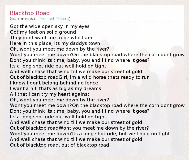 Got the wide open sky in my eyes Got my feet on solid ground They dont want me to be who I am Here in this place, its my daddys town Oh, wont you meet me down by the river? Wont you meet me down?On the blacktop road where the corn dont grow Dont you think its time, baby, you and I find where it goes? Its a long shot ride but well hold on tight And well chase that wind till we make our street of gold Out of blacktop roadGirl, Im a wild horse thats ready to run I know I dont belong behind no fence I want a hill thats as big as my dreams All that I can try my heart against Oh, wont you meet me down by the river? Wont you meet me down?On the blacktop road where the corn dont grow Dont you think its time, baby, you and I find where it goes? Its a long shot ride but well hold on tight And well chase that wind till we make our street of gold Out of blacktop roadWont you meet me down by the river? Wont you meet me down?Its a long shot ride, but well hold on tight And well chase that wind till we make our street of gold Out of blacktop road, out of blacktop road
