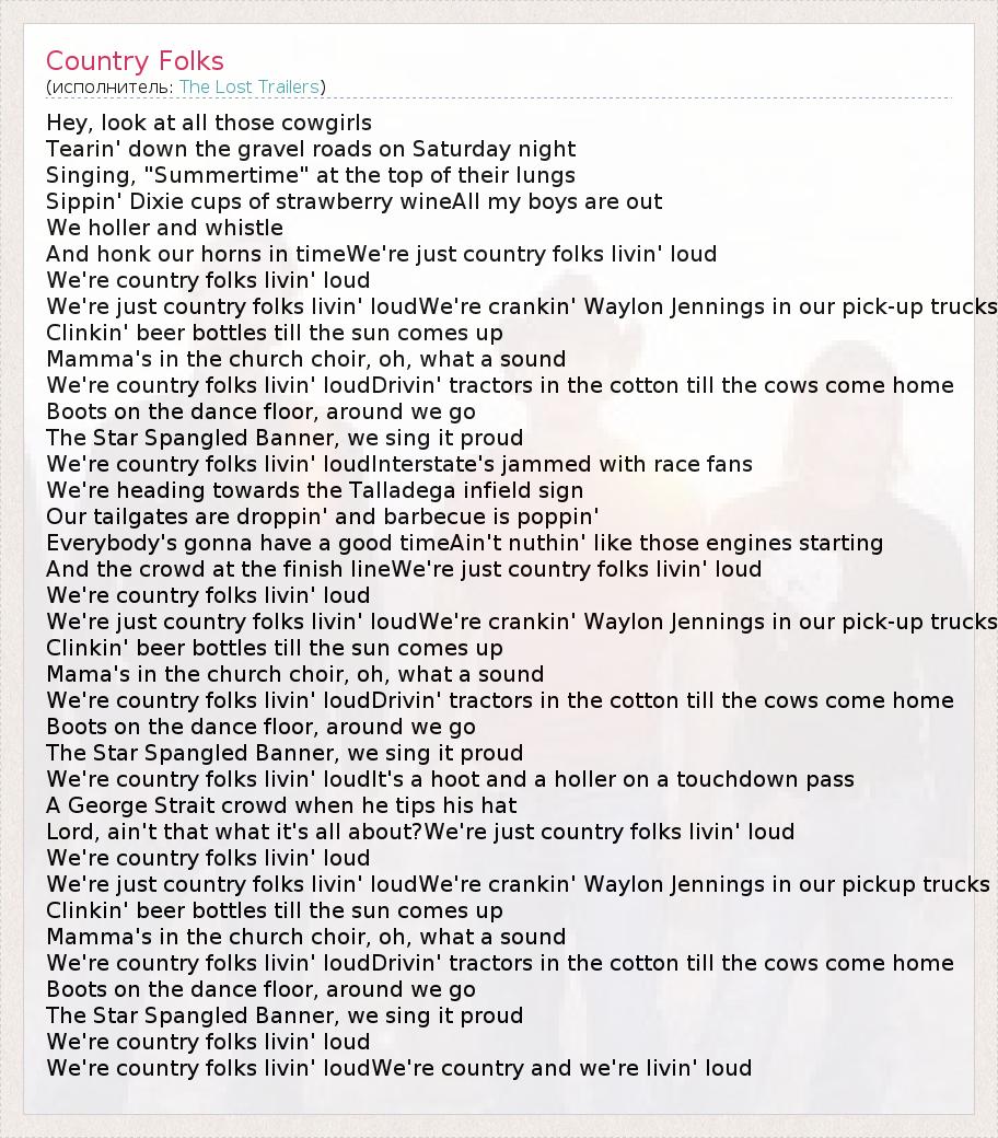 Hey, look at all those cowgirls Tearin' down the gravel roads on Saturday night Singing, "Summertime" at the top of their lungs Sippin' Dixie cups of strawberry wineAll my boys are out We holler and whistle And honk our horns in timeWe're just country folks livin' loud We're country folks livin' loud We're just country folks livin' loudWe're crankin' Waylon Jennings in our pick-up trucks Clinkin' beer bottles till the sun comes up Mamma's in the church choir, oh, what a sound We're country folks livin' loudDrivin' tractors in the cotton till the cows come home Boots on the dance floor, around we go The Star Spangled Banner, we sing it proud We're country folks livin' loudInterstate's jammed with race fans We're heading towards the Talladega infield sign Our tailgates are droppin' and barbecue is poppin' Everybody's gonna have a good timeAin't nuthin' like those engines starting And the crowd at the finish lineWe're just country folks livin' loud We're country folks livin' loud We're just country folks livin' loudWe're crankin' Waylon Jennings in our pick-up trucks Clinkin' beer bottles till the sun comes up Mama's in the church choir, oh, what a sound We're country folks livin' loudDrivin' tractors in the cotton till the cows come home Boots on the dance floor, around we go The Star Spangled Banner, we sing it proud We're country folks livin' loudIt's a hoot and a holler on a touchdown pass A George Strait crowd when he tips his hat Lord, ain't that what it's all about?We're just country folks livin' loud We're country folks livin' loud We're just country folks livin' loudWe're crankin' Waylon Jennings in our pickup trucks Clinkin' beer bottles till the sun comes up Mamma's in the church choir, oh, what a sound We're country folks livin' loudDrivin' tractors in the cotton till the cows come home Boots on the dance floor, around we go The Star Spangled Banner, we sing it proud We're country folks livin' loud We're country folks livin' loudWe're country and we're livin' loud
