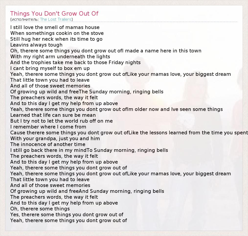 I still love the smell of mamas house When somethings cookin on the stove Still hug her neck when its time to go Leavins always tough Oh, therere some things you dont grow out ofI made a name here in this town With my right arm underneath the lights And the trophies take me back to those Friday nights I cant bring myself to box em up Yeah, therere some things you dont grow out ofLike your mamas love, your biggest dream That little town you had to leave And all of those sweet memories Of growing up wild and freeThe Sunday morning, ringing bells The preachers words, the way it felt And to this day I get my help from up above Yeah, therere some things you dont grow out ofIm older now and Ive seen some things Learned that life can sure be mean But I try not to let the world rub off on me I remember where I come from Cause therere some things you dont grow out ofLike the lessons learned from the time you spent With your grandpa, just you and him The innocence of another time I still go back there in my mindTo Sunday morning, ringing bells The preachers words, the way it felt And to this day I get my help from up above Yeah, therere some things you dont grow out of Yeah, therere some things you dont grow out ofLike your mamas love, your biggest dream That little town you had to leave And all of those sweet memories Of growing up wild and freeAnd Sunday morning, ringing bells The preachers words, the way it felt And to this day I get my help from up above Oh, therere some things Yes, therere some things you dont grow out of Yeah, therere some things you dont grow out of