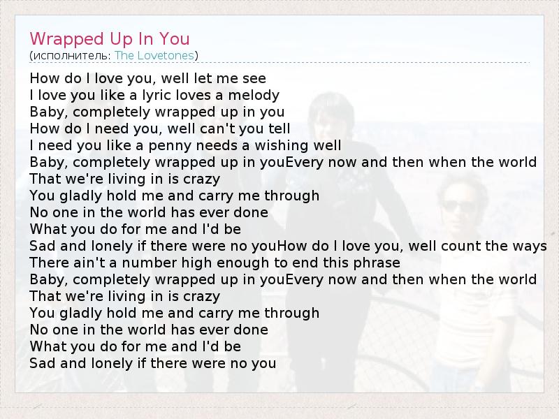 How do I love you, well let me see I love you like a lyric loves a melody Baby, completely wrapped up in you How do I need you, well can't you tell I need you like a penny needs a wishing well Baby, completely wrapped up in youEvery now and then when the world That we're living in is crazy You gladly hold me and carry me through No one in the world has ever done What you do for me and I'd be Sad and lonely if there were no youHow do I love you, well count the ways There ain't a number high enough to end this phrase Baby, completely wrapped up in youEvery now and then when the world That we're living in is crazy You gladly hold me and carry me through No one in the world has ever done What you do for me and I'd be Sad and lonely if there were no you