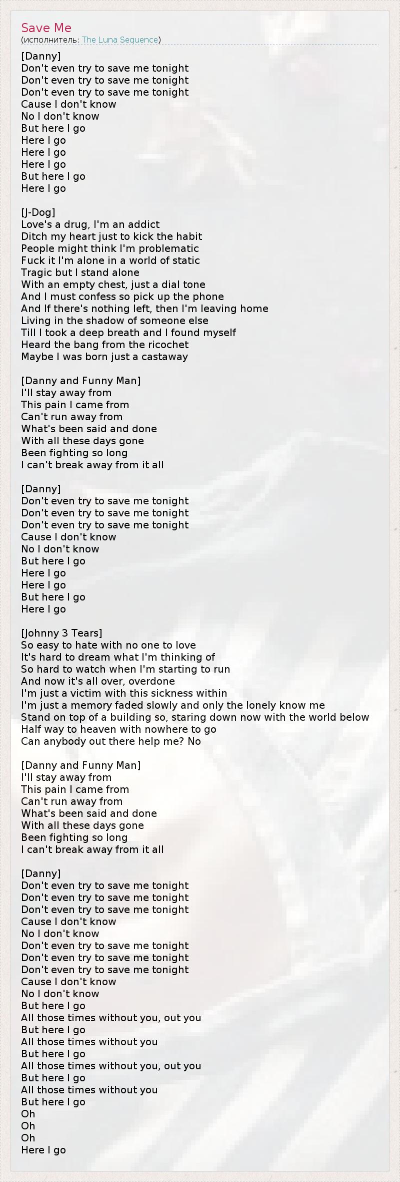 [Danny] Даже не пытайся меня спасти сегодня ночью, Даже не пытайся меня спасти сегодня ночью, Даже не пытайся меня спасти сегодня ночью, Ведь я не знаю, Правда, не знаю, И все же... Все же... Все же... Все же... И все же... Все же... [J-Dog] Любовь – наркотик, и я зависим. Хоть сердце себе вырви, чтобы избавиться от этой привычки. Люди могут подумать, что я ненадежный, И пофиг, я один в этом парализованном мире. Трагично, но я выстоял С опустошенной душой. Только гудки. Я должен кое в чем признаться, так что сними уже трубку. И если мне ничего не остается, то я возвращаюсь домой. Живу будто в чьей-то тени, Пока не сделаю глубокий вдох и не обрету себя. Слышу грохот рикошета, Может, я просто рожден быть изгоем? [Danny and Funny Man] Я буду держаться подальше От той боли, которая меня породила. Мне не сбежать от всего, Что было сказано и сделано. Я столько боролся С минувшими днями, Но не могу вырваться из этого плена. [Danny] Даже не пытайся меня спасти сегодня ночью, Даже не пытайся меня спасти сегодня ночью, Даже не пытайся меня спасти сегодня ночью, Ведь я не знаю, Правда, не знаю, И все же... Все же... Все же... И все же... Все же... [Johnny 3 Tears] Легко ненавидеть, когда некого любить, Сложно вообразить, о чем я думаю, Сложно уследить, когда я начинаю гонку. И сейчас все кончено, более чем. Я лишь жертва, пораженный этим недугом, Я лишь воспоминание, что медленно стирается, и только одинокий меня поймет. Стою на крыше здания, и всматриваюсь в мир, что под ногами. На полпути на тот свет, и деваться некуда. Хоть кто-нибудь мне поможет? Нет... [Danny and Funny Man] Я буду держаться подальше От той боли, которая меня породила. Мне не сбежать от всего, Что было сказано и сделано. Я столько боролся С минувшими днями, Но не могу вырваться из этого плена. [Danny] Даже не пытайся меня спасти сегодня ночью, Даже не пытайся меня спасти сегодня ночью, Даже не пытайся меня спасти сегодня ночью, Ведь я не знаю, Правда, не знаю. Даже не пытайся меня спасти сегодня ночью, Даже не пытайся меня спасти сегодня ночью, Даже не пытайся меня спасти сегодня ночью, Ведь я не знаю, Правда, не знаю. И все же... Всё то время без тебя... И все же... Всё то время без тебя... И все же... Всё то время без тебя... И все же... Всё то время без тебя... И все же... Ооо, Ооо, Ооо, Всё же...