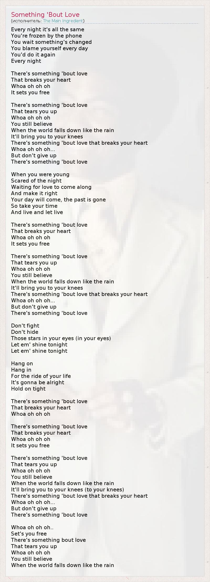 Every night it's all the same You're frozen by the phone You wait something's changed You blame yourself every day You'd do it again Every night There's something 'bout love That breaks your heart Whoa oh oh oh It sets you free There's something 'bout love That tears you up Whoa oh oh oh You still believe When the world falls down like the rain It'll bring you to your knees There's something 'bout love that breaks your heart Whoa oh oh oh... But don't give up There's something 'bout love When you were young Scared of the night Waiting for love to come along And make it right Your day will come, the past is gone So take your time And live and let live There's something 'bout love That breaks your heart Whoa oh oh oh It sets you free There's something 'bout love That tears you up Whoa oh oh oh You still believe When the world falls down like the rain It'll bring you to your knees There's something 'bout love that breaks your heart Whoa oh oh oh... But don't give up There's something 'bout love Don't fight Don't hide Those stars in your eyes (in your eyes) Let em' shine tonight Let em' shine tonight Hang on Hang in For the ride of your life It's gonna be alright Hold on tight There's something 'bout love That breaks your heart Whoa oh oh oh There's something 'bout love That breaks your heart Whoa oh oh oh It sets you free There's something 'bout love That tears you up Whoa oh oh oh You still believe When the world falls down like the rain It'll bring you to your knees (to your knees) There's something 'bout love that breaks your heart Whoa oh oh oh... But don't give up There's something 'bout love Whoa oh oh oh.. Set's you free There's something bout love That tears you up Whoa oh oh oh You still believe When the world falls down like the rain