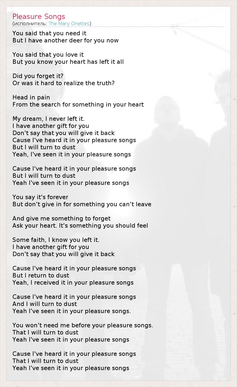 You said that you need it But I have another deer for you now You said that you love it But you know your heart has left it all Did you forget it? Or was it hard to realize the truth? Head in pain From the search for something in your heart My dream, I never left it. I have another gift for you Don't say that you will give it back Cause I've heard it in your pleasure songs But I will turn to dust Yeah, I've seen it in your pleasure songs Cause I've heard it in your pleasure songs But I will turn to dust Yeah I've seen it in your pleasure songs You say it's forever But don't give in for something you can't leave And give me something to forget Ask your heart. It's something you should feel Some faith, I know you left it. I have another gift for you Don't say that you will give it back Cause I've heard it in your pleasure songs But I return to dust Yeah, I received it in your pleasure songs Cause I've heard it in your pleasure songs And I will turn to dust Yeah I've seen it in your pleasure songs. You won't need me before your pleasure songs. That I will turn to dust Yeah I've seen it in your pleasure songs Cause I've heard it in your pleasure songs That I will turn to dust Yeah I've seen it in your pleasure songs