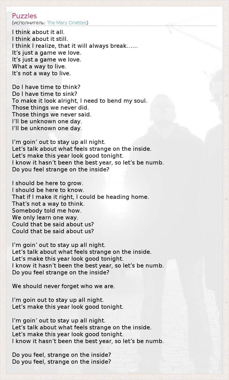 I think about it all. I think about it still. I think I realize, that it will always break…… It’s just a game we love. It’s just a game we love. What a way to live. It’s not a way to live. Do I have time to think? Do I have time to sink? To make it look alright, I need to bend my soul. Those things we never did. Those things we never said. I’ll be unknown one day. I’ll be unknown one day. I’m goin’ out to stay up all night. Let’s talk about what feels strange on the inside. Let’s make this year look good tonight. I know it hasn’t been the best year, so let’s be numb. Do you feel strange on the inside? I should be here to grow. I should be here to know. That if I make it right, I could be heading home. That’s not a way to think. Somebody told me how. We only learn one way. Could that be said about us? Could that be said about us? I’m goin’ out to stay up all night. Let’s talk about what feels strange on the inside. Let’s make this year look good tonight. I know it hasn’t been the best year, so let’s be numb. Do you feel strange on the inside? We should never forget who we are. I’m goin out to stay up all night. Let’s make this year look good tonight. I’m goin’ out to stay up all night. Let’s talk about what feels strange on the inside. Let’s make this year look good tonight. I know it hasn’t been the best year, so let’s be numb. Do you feel, strange on the inside? Do you feel, strange on the inside?