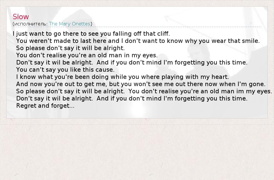 I just want to go there to see you falling off that cliff. You weren't made to last here and I don't want to know why you wear that smile. So please don't say it will be alright. You don't realise you're an old man in my eyes. Don't say it wil be alright. And if you don't mind I'm forgetting you this time. You can't say you like this cause. I know what you're been doing while you where playing with my heart. And now you're out to get me, but you won't see me out there now when I'm gone. So please don't say it will be alright. You don't realise you're an old man im my eyes. Don't say it wil be alright. And if you don't mind I'm forgetting you this time. Regret and forget...