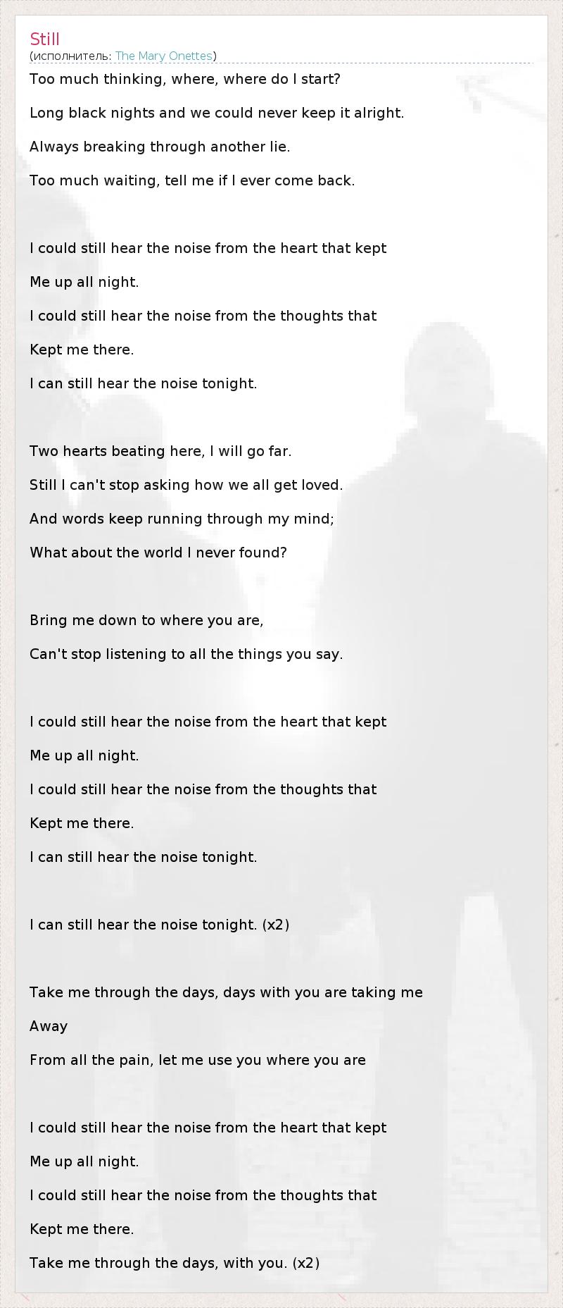 Too much thinking, where, where do I start? Long black nights and we could never keep it alright. Always breaking through another lie. Too much waiting, tell me if I ever come back. I could still hear the noise from the heart that kept Me up all night. I could still hear the noise from the thoughts that Kept me there. I can still hear the noise tonight. Two hearts beating here, I will go far. Still I can't stop asking how we all get loved. And words keep running through my mind; What about the world I never found? Bring me down to where you are, Can't stop listening to all the things you say. I could still hear the noise from the heart that kept Me up all night. I could still hear the noise from the thoughts that Kept me there. I can still hear the noise tonight. I can still hear the noise tonight. (x2) Take me through the days, days with you are taking me Away From all the pain, let me use you where you are I could still hear the noise from the heart that kept Me up all night. I could still hear the noise from the thoughts that Kept me there. Take me through the days, with you. (x2)