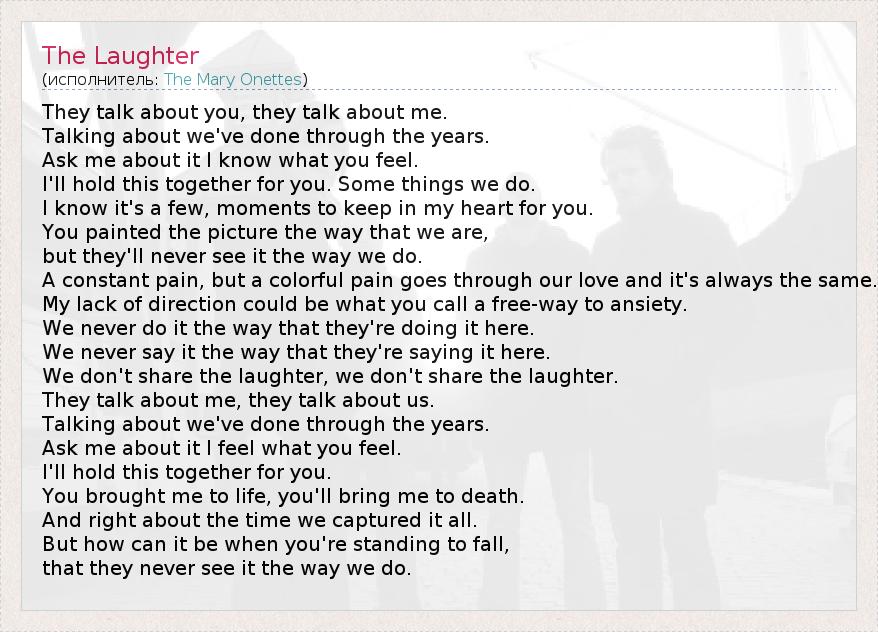 They talk about you, they talk about me. Talking about we've done through the years. Ask me about it I know what you feel. I'll hold this together for you. Some things we do. I know it's a few, moments to keep in my heart for you. You painted the picture the way that we are, but they'll never see it the way we do. A constant pain, but a colorful pain goes through our love and it's always the same. My lack of direction could be what you call a free-way to ansiety. We never do it the way that they're doing it here. We never say it the way that they're saying it here. We don't share the laughter, we don't share the laughter. They talk about me, they talk about us. Talking about we've done through the years. Ask me about it I feel what you feel. I'll hold this together for you. You brought me to life, you'll bring me to death. And right about the time we captured it all. But how can it be when you're standing to fall, that they never see it the way we do.