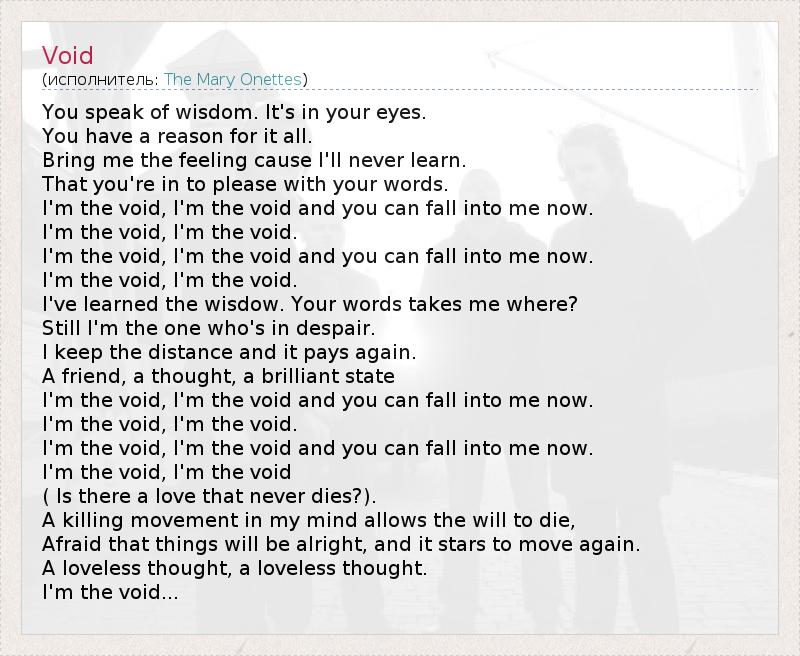 Вы говорите о мудрости. Это в ваших глазах. У вас есть повод для всего этого. Принеси мне чувство , потому что я никогда не буду учиться. То, что вы находитесь в порадовать ваших слов . Я пустота , я пустота , и вы можете попасть в меня. Я пустота , я пустота . Я пустота , я пустота , и вы можете попасть в меня. Я пустота , я пустота . Я узнал wisdow . Ваши слова берет меня где ? Тем не менее я тот, кто в отчаянии . Я держу дистанцию , и он платит еще раз. Друг , мысль , блестящий государство Я пустота , я пустота , и вы можете попасть в меня. Я пустота , я пустота . Я пустота , я пустота , и вы можете попасть в меня. Я пустота , я пустота ( Есть любовь, которая никогда не умирает ? ) . Движение убийство , на мой взгляд позволяет воля к смерти , Боясь , что все будет в порядке , и это играет двигаться снова . Без любви мысль , без любви мысль . Я пустота ...