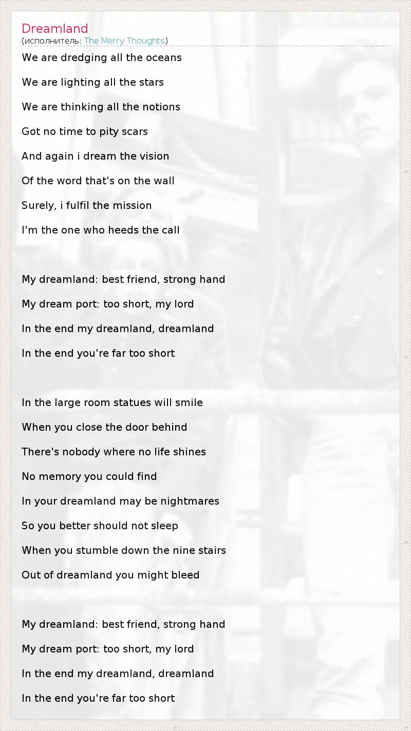 We are dredging all the oceans We are lighting all the stars We are thinking all the notions Got no time to pity scars And again i dream the vision Of the word that's on the wall Surely, i fulfil the mission I'm the one who heeds the call My dreamland: best friend, strong hand My dream port: too short, my lord In the end my dreamland, dreamland In the end you're far too short In the large room statues will smile When you close the door behind There's nobody where no life shines No memory you could find In your dreamland may be nightmares So you better should not sleep When you stumble down the nine stairs Out of dreamland you might bleed My dreamland: best friend, strong hand My dream port: too short, my lord In the end my dreamland, dreamland In the end you're far too short
