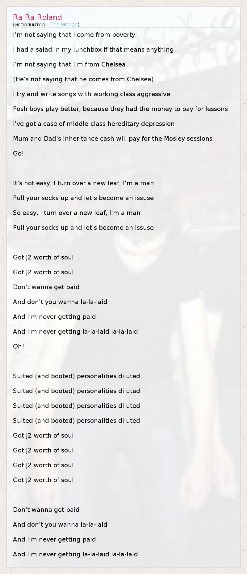 I'm not saying that I come from poverty I had a salad in my lunchbox if that means anything I'm not saying that I'm from Chelsea (He's not saying that he comes from Chelsea) I try and write songs with working class aggressive Posh boys play better, because they had the money to pay for lessons I've got a case of middle-class hereditary depression Mum and Dad's inheritance cash will pay for the Mosley sessions Go! It's not easy, I turn over a new leaf, I'm a man Pull your socks up and let's become an issuse So easy, I turn over a new leaf, I'm a man Pull your socks up and let's become an issuse Got Ј2 worth of soul Got Ј2 worth of soul Don't wanna get paid And don't you wanna la-la-laid And I'm never getting paid And I'm never getting la-la-laid la-la-laid Oh! Suited (and booted) personalities diluted Suited (and booted) personalities diluted Suited (and booted) personalities diluted Suited (and booted) personalities diluted Got Ј2 worth of soul Got Ј2 worth of soul Got Ј2 worth of soul Got Ј2 worth of soul Don't wanna get paid And don't you wanna la-la-laid And I'm never getting paid And I'm never getting la-la-laid la-la-laid
