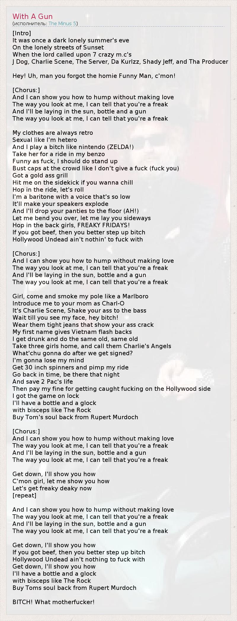 [Пролог:] Дело было накануне одинокого летнего вечера На пустынных улицах Сансет – Именно тогда Господь созвал 7 ошалелых эМСи: J Dog, Charlie Scene, The Server, Da Kurlzz, Shady Jeff, и Tha Producer! Эй, друг, ты забыл братана Funny Man, поехали! [Припев:] Я покажу тебе, как тереться друг о друга, не занимаясь сексом. По твоему взгляду видно, что ты озабоченная. Я буду греться на солнышке, сжимая в одной руке бутылку, в другой – пушку. По твоему взгляду видно, что ты озабоченная. Я всегда стильно одеваюсь, Сексуален, словно я гетеро, И играю с су*ками, как на Nintendo (ZELDA) Беру её прокатиться на своём мерине, Это чертовски весело. Пожалуй, я даже встану И расстреляю толпу, словно мне плевать (пошли вы!) Ведь у меня все зубы золотые. Поэтому звякни мне*, если захочешь проветриться. Запрыгивай в тачку, давай покатаемся! Я баритон с низким голосом, Отчего колонки просто взрываются, А девичьи трусики падают на пол (Ах!) Позволь мне нагнуть тебя и распластать во все стороны. Запрыгивайте назад, девочки, это безбашенная пятница! Если ты имеешь что-то против, сделай шаг вперёд, су*а, - Hollywood Undead не те, с кем можно тягаться! [Припев:] Я покажу тебе, как тереться друг о друга, не занимаясь сексом. По твоему взгляду видно, что ты озабоченная. Я буду греться на солнышке, сжимая в одной руке бутылку, в другой – пушку. По твоему взгляду видно, что ты озабоченная. Детка, давай, покури мой шест, как Марльборо, Представь меня своей мамочке как Карл-о. Это Charlie Scene, трясите задом в такт басам! Подожди, я открою тебе своё лицо, ты, су*а! Твои джинсы так обтягивают, что видно ложбинку между ягодицами. Моё имя напоминает о Вьетнаме, Тогда я напиваюсь и занимаюсь тем же, что и всегда: Еду домой с тремя девочками и называю их Ангелами Чарли. Что вы будете делать после того, как мы скрепим договор подписями? Я потеряю рассудок, Найду крутых механиков, чтобы прокачать свою тачку, А потом отправлюсь в прошлое, окажусь в ту злополучную ночь рядом с Тупаком, Чтобы спасти ему жизнь, И, наконец, оплачу штраф за секс в одном из общественных мест Голливуда. У меня вся игра под контролем – У меня будет бутылка, пушка И твёрдые, как скала, бицепсы. Я выкуплю душу Тома у Руперта Мёрдока**. [Припев:] Я покажу тебе, как тереться друг о друга, не занимаясь сексом. По твоему взгляду видно, что ты озабоченная. Я буду греться на солнышке, сжимая в одной руке бутылку, в другой – пушку. По твоему взгляду видно, что ты озабоченная. Давай, я покажу тебе, как, Давай, детка, позволь мне показать тебе, как! Давай сейчас немного пошалим! [Повтор] Я покажу тебе, как тереться друг о друга, не занимаясь сексом. По твоему взгляду видно, что ты озабоченная. Я буду греться на солнышке, сжимая в одной руке бутылку, в другой – пушку. По твоему взгляду видно, что ты озабоченная. Давай, я покажу тебе, как, Если ты имеешь что-то против, сделай шаг вперёд, су*а, - Hollywood Undead не те, с кем можно тягаться! Давай, я покажу тебе, как! У меня будет бутылка, пушка И твёрдые, как скала, бицепсы. Я выкуплю душу Тома у Руперта Мёрдока. Су*а! Какой ублюдок! * - используемое здесь слово 'kickback’ – это сленговый вариант ‘PDA phone’ (КПК с функцией телефона) ** - здесь речь идёт о Томе Андерсоне (Tom Anderson), основателе Myspace, продавшем его Руперту Мёрдоку (Rupert Murdoch) за 580 миллионов долларов. Таким образом, Myspace в этом контексте приравнивается к душе Тома.