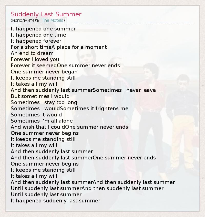 It happened one summer It happened one time It happened forever For a short timeA place for a moment An end to dream Forever I loved you Forever it seemedOne summer never ends One summer never began It keeps me standing still It takes all my will And then suddenly last summerSometimes I never leave But sometimes I would Sometimes I stay too long Sometimes I wouldSometimes it frightens me Sometimes it would Sometimes I'm all alone And wish that I couldOne summer never ends One summer never begins It keeps me standing still It takes all my will And then suddenly last summer And then suddenly last summerOne summer never ends One summer never begins It keeps me standing still It takes all my will And then suddenly last summerAnd then suddenly last summer Until suddenly last summerAnd then suddenly last summer Until suddenly last summer It happened suddenly last summer
