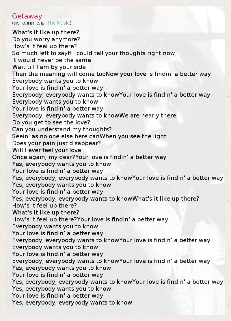 What's it like up there? Do you worry anymore? How's it feel up there? So much left to sayIf I could tell your thoughts right now It would never be the same Wait till I am by your side Then the meaning will come tooNow your love is findin' a better way Everybody wants you to know Your love is findin' a better way Everybody, everybody wants to knowYour love is findin' a better way Everybody wants you to know Your love is findin' a better way Everybody, everybody wants to knowWe are nearly there Do you get to see the love? Can you understand my thoughts? Seein' as no one else here canWhen you see the light Does your pain just disappear? Will I ever feel your love Once again, my dear?Your love is findin' a better way Yes, everybody wants you to know Your love is findin' a better way Yes, everybody, everybody wants to knowYour love is findin' a better way Yes, everybody wants you to know Your love is findin' a better way Yes, everybody, everybody wants to knowWhat's it like up there? How's it feel up there? What's it like up there? How's it feel up there?Your love is findin' a better way Everybody wants you to know Your love is findin' a better way Everybody, everybody wants to knowYour love is findin' a better way Everybody wants you to know Your love is findin' a better way Everybody, everybody wants to knowYour love is findin' a better way Yes, everybody wants you to know Your love is findin' a better way Yes, everybody, everybody wants to knowYour love is findin' a better way Yes, everybody wants you to know Your love is findin' a better way Yes, everybody, everybody wants to know