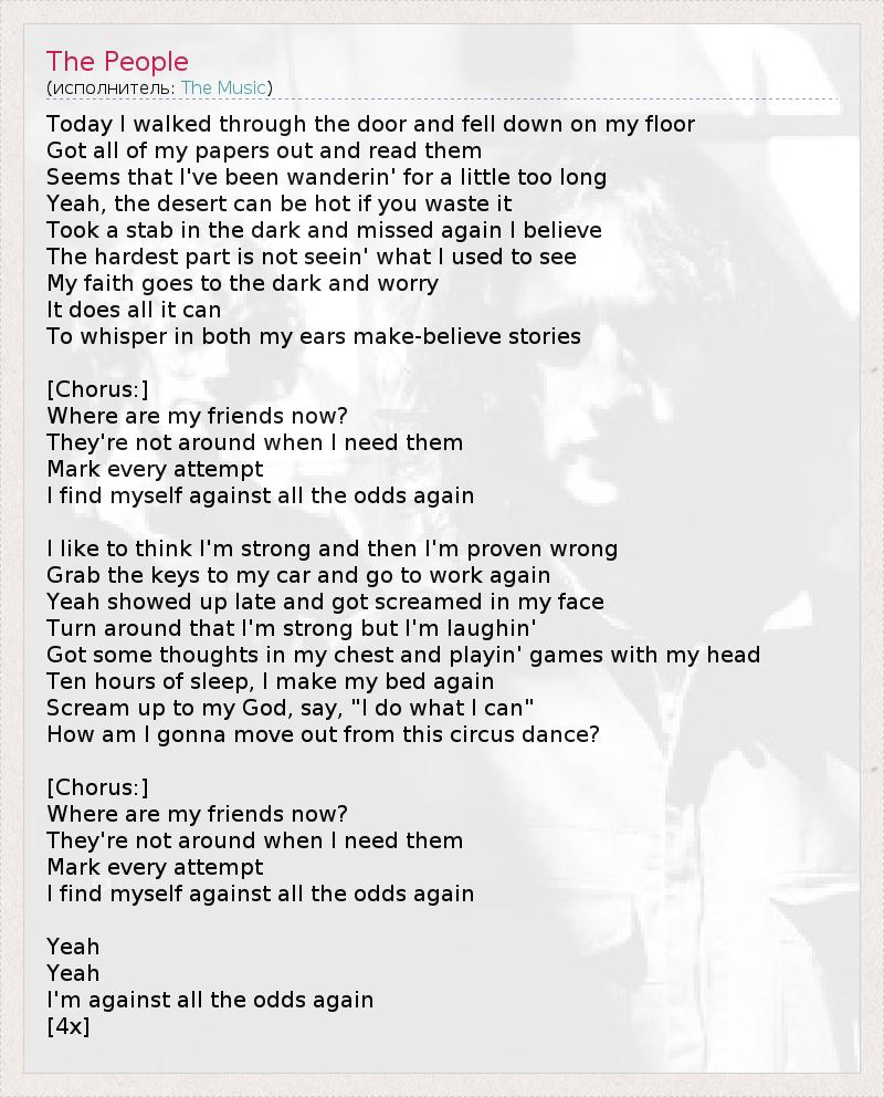 Today I walked through the door and fell down on my floor Got all of my papers out and read them Seems that I've been wanderin' for a little too long Yeah, the desert can be hot if you waste it Took a stab in the dark and missed again I believe The hardest part is not seein' what I used to see My faith goes to the dark and worry It does all it can To whisper in both my ears make-believe stories [Chorus:] Where are my friends now? They're not around when I need them Mark every attempt I find myself against all the odds again I like to think I'm strong and then I'm proven wrong Grab the keys to my car and go to work again Yeah showed up late and got screamed in my face Turn around that I'm strong but I'm laughin' Got some thoughts in my chest and playin' games with my head Ten hours of sleep, I make my bed again Scream up to my God, say, "I do what I can" How am I gonna move out from this circus dance? [Chorus:] Where are my friends now? They're not around when I need them Mark every attempt I find myself against all the odds again Yeah Yeah I'm against all the odds again [4x]