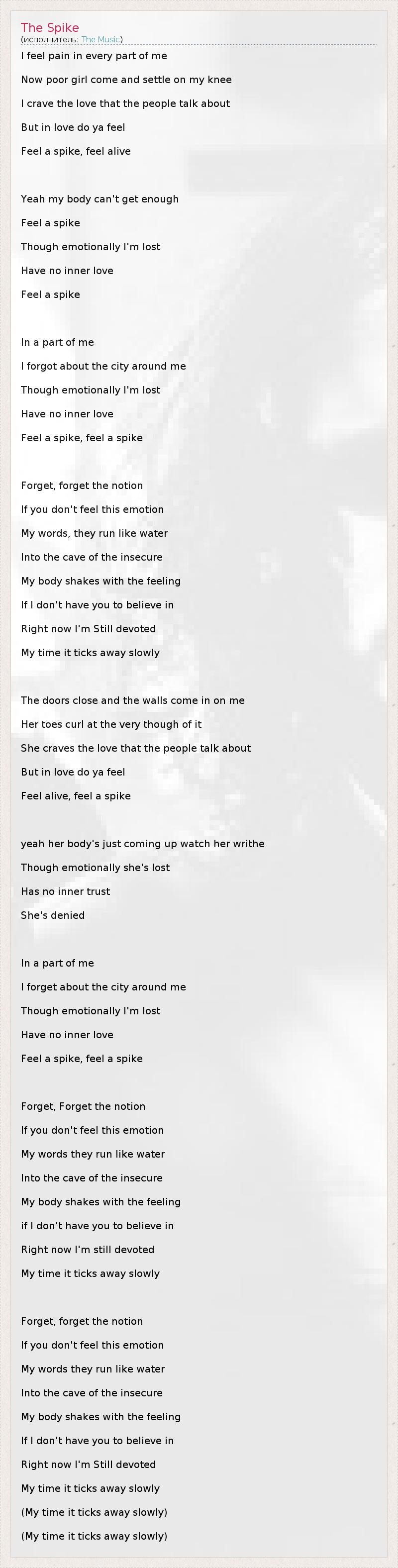 I feel pain in every part of me Now poor girl come and settle on my knee I crave the love that the people talk about But in love do ya feel Feel a spike, feel alive Yeah my body can't get enough Feel a spike Though emotionally I'm lost Have no inner love Feel a spike In a part of me I forgot about the city around me Though emotionally I'm lost Have no inner love Feel a spike, feel a spike Forget, forget the notion If you don't feel this emotion My words, they run like water Into the cave of the insecure My body shakes with the feeling If I don't have you to believe in Right now I'm Still devoted My time it ticks away slowly The doors close and the walls come in on me Her toes curl at the very though of it She craves the love that the people talk about But in love do ya feel Feel alive, feel a spike yeah her body's just coming up watch her writhe Though emotionally she's lost Has no inner trust She's denied In a part of me I forget about the city around me Though emotionally I'm lost Have no inner love Feel a spike, feel a spike Forget, Forget the notion If you don't feel this emotion My words they run like water Into the cave of the insecure My body shakes with the feeling if I don't have you to believe in Right now I'm still devoted My time it ticks away slowly Forget, forget the notion If you don't feel this emotion My words they run like water Into the cave of the insecure My body shakes with the feeling If I don't have you to believe in Right now I'm Still devoted My time it ticks away slowly (My time it ticks away slowly) (My time it ticks away slowly)