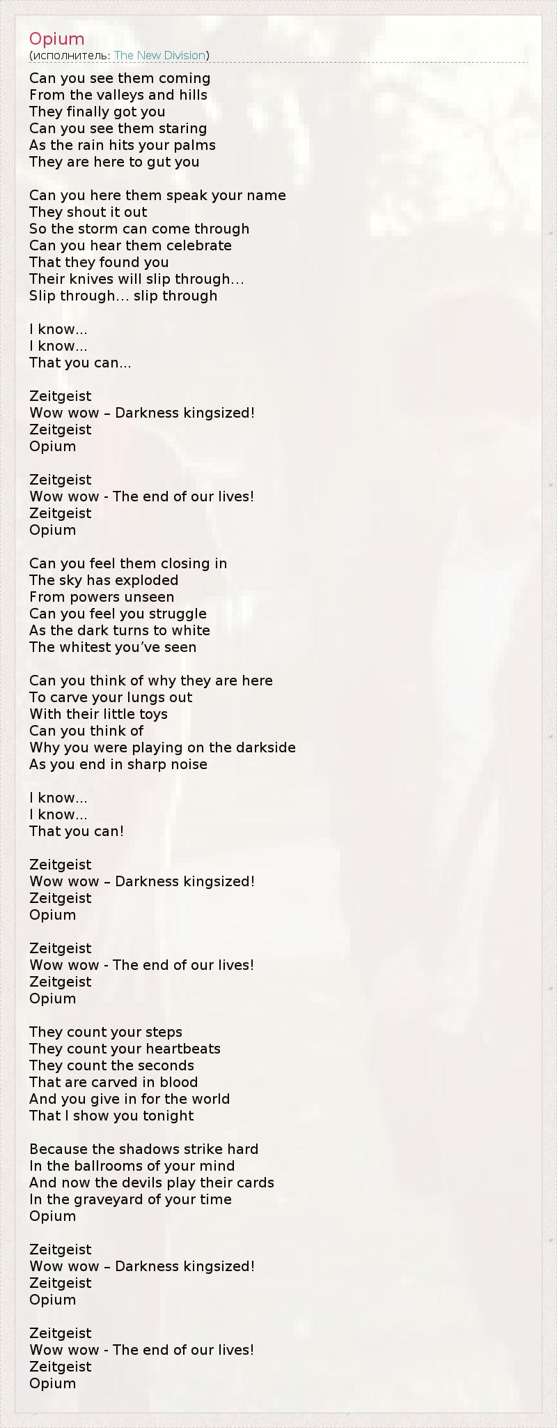 Видишь ли ты, как они спускаются С долин и холмов? Они наконец заполучили тебя. Видишь ли ты, как они пристально смотрят на то, Как дождь барабанит по твоим ладоням? Они здесь, чтобы уничтожить тебя. Слышишь ли ты, как они произносят твое имя? Они выкрикивают его так, Что этим криком можно вызвать бурю. Слышишь ли ты, как они радуются, Что нашли тебя? Их ножи вонзятся... Вонзятся...вонзятся Я знаю... Я знаю... Ты можешь... Дух времени. Ничего себе! – Темноты королевский размер! Дух времени. Опиум. Дух времени. Ничего себе! – Конец наших жизней! Дух времени. Опиум. Чувствуешь ли ты, как они тебя окружают? Небеса отвержены Незримыми силами. Чувствуешь ли ты, что борешься, Когда мрак облачается в белое одеяние? Самое белое, что ты когда-либо видел. Догадываешься ли ты, для чего они хотят Добраться до твоих легких Своими «милыми игрушками»? Догадываешься ли ты, Почему ты играл на темной стороне, Когда конец твой от ножа близок? Я знаю... Я знаю... Ты можешь... Дух времени. Ничего себе! – Темноты королевский размер! Дух времени. Опиум. Дух времени. Ничего себе! – Конец наших жизней! Дух времени. Опиум. Они считаю твои шаги. Они считают твои удары сердца. Они считают секунды, Что высечено на крови. И ты сдаешься ради того мира, Что я тебе сегодня открываю. Тени бесцеремонно атакуют Лабиринты твоего сознания. А демоны раскидывают свои карты На могильном дворе твоего времени. Опиум. Дух времени. Ничего себе! – Темноты королевский размер! Дух времени. Опиум. Дух времени. Ничего себе! – Конец наших жизней! Дух времени. Опиум.