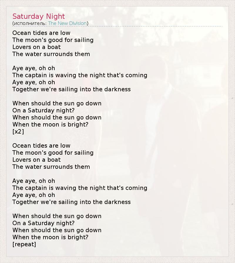 Океанские приливы являются низкими Хорошо Луны для плавания Влюбленные на лодке Вода окружает их Слушаюсь , о, о, Капитан размахивая ночь , что пришествие Слушаюсь , о, о, Вместе мы плавание в темноте Когда следует зайдет солнце На субботу ночью ? Когда следует зайдет солнце Когда луна ярко ? [ x2 ] Океанские приливы являются низкими Хорошо Луны для плавания Влюбленные на лодке Вода окружает их Слушаюсь , о, о, Капитан размахивая ночь , что пришествие Слушаюсь , о, о, Вместе мы плавание в темноте Когда следует зайдет солнце На субботу ночью ? Когда следует зайдет солнце Когда луна ярко ? [ ПОВТОР]