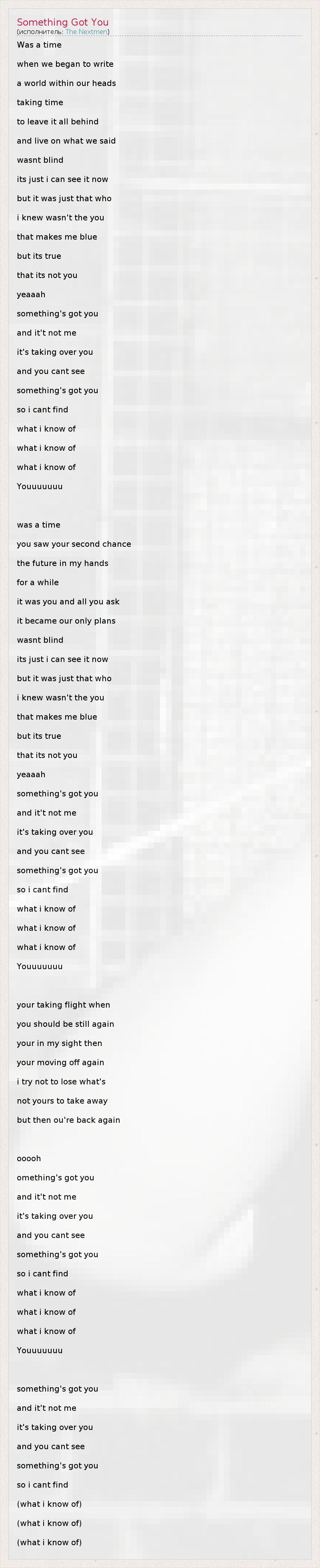 Was a time when we began to write a world within our heads taking time to leave it all behind and live on what we said wasnt blind its just i can see it now but it was just that who i knew wasn't the you that makes me blue but its true that its not you yeaaah something's got you and it't not me it's taking over you and you cant see something's got you so i cant find what i know of what i know of what i know of Youuuuuuu was a time you saw your second chance the future in my hands for a while it was you and all you ask it became our only plans wasnt blind its just i can see it now but it was just that who i knew wasn't the you that makes me blue but its true that its not you yeaaah something's got you and it't not me it's taking over you and you cant see something's got you so i cant find what i know of what i know of what i know of Youuuuuuu your taking flight when you should be still again your in my sight then your moving off again i try not to lose what's not yours to take away but then ou're back again ooooh omething's got you and it't not me it's taking over you and you cant see something's got you so i cant find what i know of what i know of what i know of Youuuuuuu something's got you and it't not me it's taking over you and you cant see something's got you so i cant find (what i know of) (what i know of) (what i know of)
