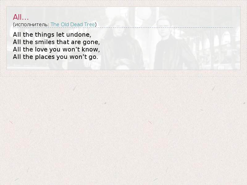 Это интересно:О группе The Dead Old Tree известно немногое. Возникла в 1997 году; записала одно демо и два альбома. Запись 2003 года The Nameless Disease посвящена Фредерику Гильмо — барабанщику, покончившему жизнь самоубийством."The Old Dead Tree больше нет. Я надеялся, что мне никогда не придется писать этих слов, но ничто не вечно. Последние несколько месяцев в группе стали нарастать некоторые разногласия по поводу обязательств... продолжение