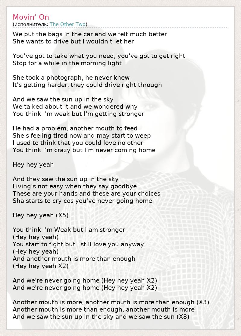 We put the bags in the car and we felt much better She wants to drive but I wouldn't let her You've got to take what you need, you've got to get right Stop for a while in the morning light She took a photograph, he never knew It's getting harder, they could drive right through And we saw the sun up in the sky We talked about it and we wondered why You think I'm weak but I'm getting stronger He had a problem, another mouth to feed She's feeling tired now and may start to weep I used to think that you could love no other You think I'm crazy but I'm never coming home Hey hey yeah And they saw the sun up in the sky Living's not easy when they say goodbye These are your hands and these are your choices Sha starts to cry cos you've never going home Hey hey yeah (X5) You think I'm Weak but I am stronger (Hey hey yeah) You start to fight but I still love you anyway (Hey hey yeah) And another mouth is more than enough (Hey hey yeah X2) And we're never going home (Hey hey yeah X2) And we're never going home (Hey hey yeah X2) Another mouth is more, another mouth is more than enough (X3) Another mouth is more than enough, another mouth is more And we saw the sun up in the sky and we saw the sun (X8)