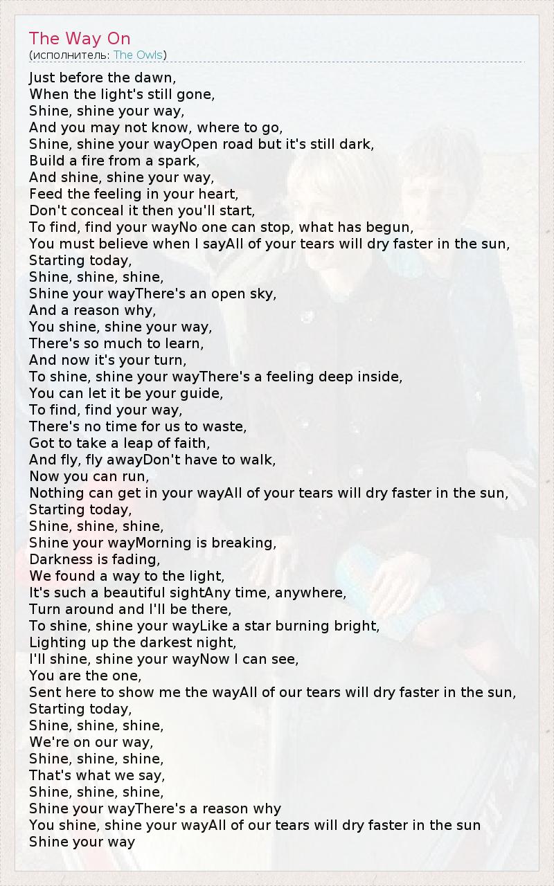 You shine, shine your wayAll of our tears will dry faster in the sun