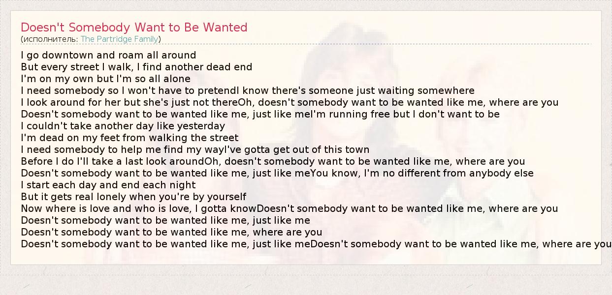 ГлавнаяИсполнителиThe Partridge FamilyDoesn't Somebody Want to Be Wanted