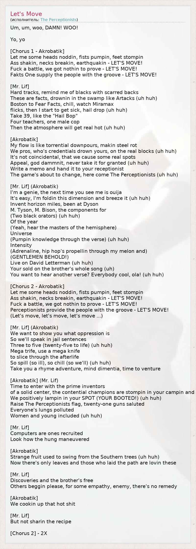 Um, um, woo, DAMN! WOO! Yo, yo [Chorus 1 - Akrobatik] Let me some heads noddin, fists pumpin, feet stompin Ass shakin, necks breakin, earthquakin - LET'S MOVE! Fuck a battle, we got nothin to prove - LET'S MOVE! Fakts One supply the people with the groove - LET'S MOVE! [Mr. Lif] Hard tracks, remind me of blacks with scarred backs These are facts, drownin in the swamp like Artacks (uh huh) Boston to Fear Facts, chill, watch Miramax flicks, then I start to get sick, hail drop (uh huh) Take 39, like the "Hail Bop" Four teachers, one male cop Then the atmosphere will get real hot (uh huh) [Akrobatik] My flow is like torrential downpours, makin steel rot We pros, who's credentials drown yours, on the real blocks (uh huh) It's not coincidental, that we cause some real spots Appeal, god dammnit, never take it for granted (uh huh) Write a memo and hand it to your receptionist The game's about to change, here come The Perceptionists (uh huh) [Mr. Lif] (Akrobatik) I'm a genie, the next time you see me is ouija It's easy, I'm foldin this dimension and breeze it (uh huh) Invent horizon miles, been at Dyson M. Tyson, M. Bison, the components for (Two black orators) (uh huh) Of the year (Yeah, hear the masters of the hemisphere) Universe (Pumpin knowledge through the verse) (uh huh) Intensity (Adrenaline, hip hop's propellin through my melon and) (GENTLEMEN BEHOLD!) Live on David Letterman (uh huh) Your sold on the brother's whole song (uh) You want to hear another verse? Everybody cool, ola! (uh huh) [Chorus 2 - Akrobatik] Let me some heads noddin, fists pumpin, feet stompin Ass shakin, necks breakin, earthquakin - LET'S MOVE! Fuck a battle, we got nothin to prove - LET'S MOVE! Perceptionists provide the people with the groove - LET'S MOVE! (Let's move, let's move, let's move ...) [Mr. Lif] (Akrobatik) We want to show you what oppression is So we'll speak in jail sentences Three to five (twenty-five to life) (uh huh) Mega trife, use a mega knife to slice through the afterlife So spill (so ill), so chill (so we'll) (uh huh) Take you a rhyme adventure, mind dimentia, time to venture [Akrobatik] (Mr. Lif) Time to enter with the prime inventors of a solid center, the contential champions are stompin in your campin and We positively lampin in your SPOT (YOUR BOOTED!) (uh huh) Raise The Perceptionists flag, twenty-one guns saluted Everyone's lungs polluted Women and young included (uh huh) [Mr. Lif] Computers are ones recruited Look how the hung maneuvered [Akrobatik] Strange fruit used to swing from the Southern trees (uh huh) Now there's only leaves and those who laid the path are lovin these [Mr. Lif] Discoveries and the brother's free Others beggin please, for some empathy, enemy, there's no remedy [Akrobatik] We cookin up that hot shit [Mr. Lif] But not sharin the recipe [Chorus 2] - 2X