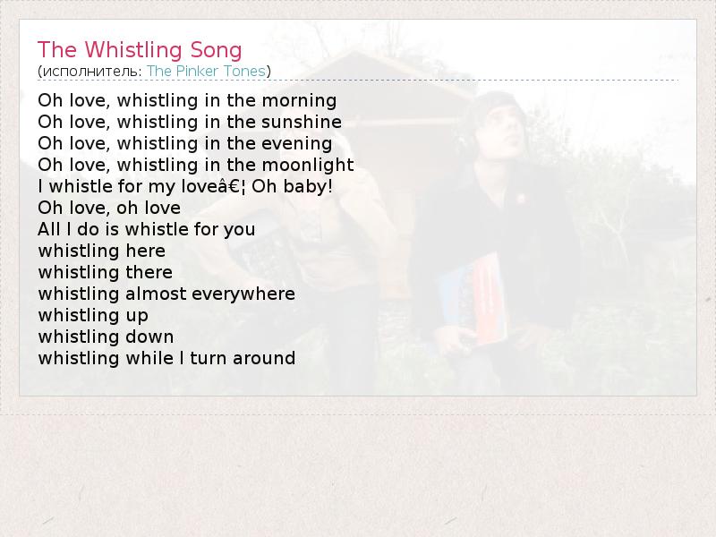Oh love, whistling in the morning Oh love, whistling in the sunshine Oh love, whistling in the evening Oh love, whistling in the moonlight I whistle for my love… Oh baby! Oh love, oh love All I do is whistle for you whistling here whistling there whistling almost everywhere whistling up whistling down whistling while I turn around