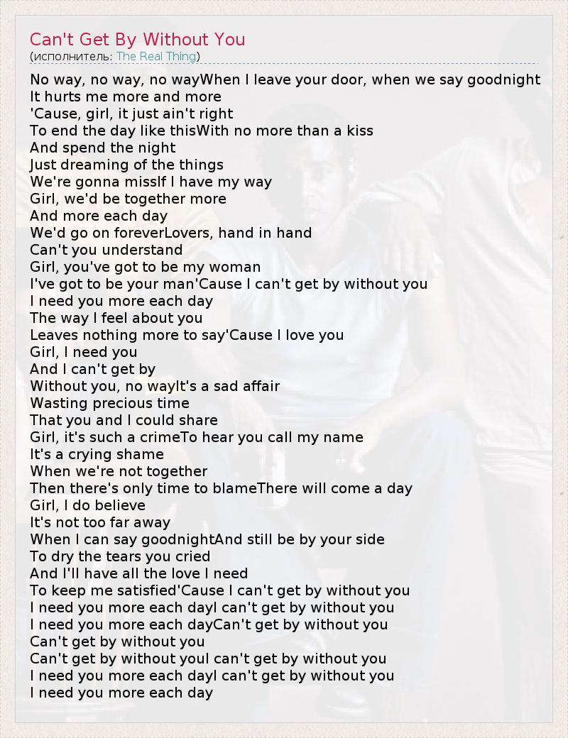 No way, no way, no wayWhen I leave your door, when we say goodnight It hurts me more and more 'Cause, girl, it just ain't right To end the day like thisWith no more than a kiss And spend the night Just dreaming of the things We're gonna missIf I have my way Girl, we'd be together more And more each day We'd go on foreverLovers, hand in hand Can't you understand Girl, you've got to be my woman I've got to be your man'Cause I can't get by without you I need you more each day The way I feel about you Leaves nothing more to say'Cause I love you Girl, I need you And I can't get by Without you, no wayIt's a sad affair Wasting precious time That you and I could share Girl, it's such a crimeTo hear you call my name It's a crying shame When we're not together Then there's only time to blameThere will come a day Girl, I do believe It's not too far away When I can say goodnightAnd still be by your side To dry the tears you cried And I'll have all the love I need To keep me satisfied'Cause I can't get by without you I need you more each dayI can't get by without you I need you more each dayCan't get by without you Can't get by without you Can't get by without youI can't get by without you I need you more each dayI can't get by without you I need you more each day