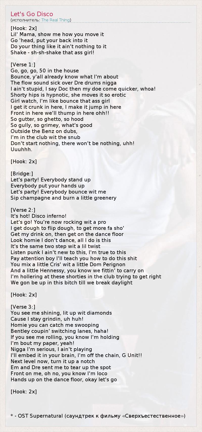 [Hook: 2x] Lil' Mama, show me how you move it Go 'head, put your back into it Do your thing like it ain't nothing to it Shake - sh-sh-shake that ass girl! [Verse 1:] Go, go, go, 50 in the house Bounce, y'all already know what I'm about The flow sound sick over Dre drums nigga I ain't stupid, I say Doc then my doe come quicker, whoa! Shorty hips is hypnotic, she moves it so erotic Girl watch, I'm like bounce that ass girl I get it crunk in here, I make it jump in here Front in here we'll thump in here ohh!! So gutter, so ghetto, so hood So gully, so grimey, what's good Outside the Benz on dubs, I'm in the club wit the snub Don't start nothing, there won't be nothing, uhh! Uuuhhh. [Hook: 2x] [Bridge:] Let's party! Everybody stand up Everybody put your hands up Let's party! Everybody bounce wit me Sip champagne and burn a little greenery [Verse 2:] It's hot! Disco inferno! Let's go! You're now rocking wit a pro I get dough to flip dough, to get more fa sho' Get my drink on, then get on the dance floor Look homie I don't dance, all I do is this It's the same two step wit a lil twist Listen punk I ain't new to this, I'm true to this Pay attention boy I'll teach you how to do this shit You mix a little Cris' wit a little Dom Perignon And a little Hennessy, you know we fittin' to carry on I'm hollering at these shorties in the club trying to get right We gon be up in this bitch till we break daylight [Hook: 2x] [Verse 3:] You see me shining, lit up wit diamonds Cause I stay grindin, uh huh! Homie you can catch me swooping Bentley coupin' switching lanes, haha! If you see me rolling, you know I'm holding I'm bout my paper, yeah! Nigga I'm serious, I ain't playing I'll embed it in your brain, I'm off the chain, G Unit!! Next level now, turn it up a notch Em and Dre sent me to tear up the spot Front on me, oh no, you know I'm loco Hands up on the dance floor, okay let's go [Hook: 2x] * - OST Supernatural (саундтрек к фильму «Сверхъестественное»)
