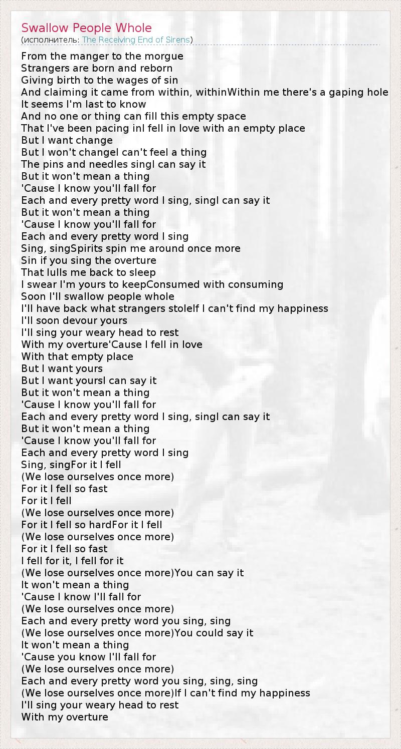 А как ты думаешь, о чем песня "Swallow People Whole" ?