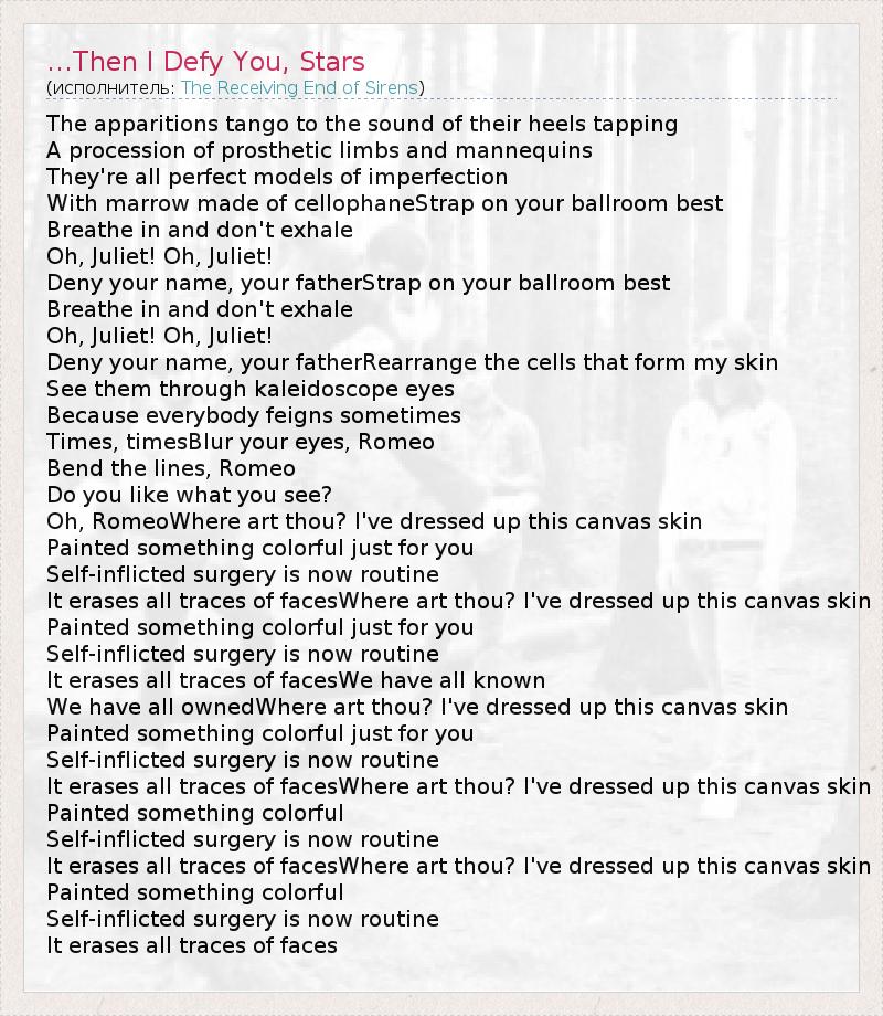The apparitions tango to the sound of their heels tapping A procession of prosthetic limbs and mannequins They're all perfect models of imperfection With marrow made of cellophaneStrap on your ballroom best Breathe in and don't exhale Oh, Juliet! Oh, Juliet! Deny your name, your fatherStrap on your ballroom best Breathe in and don't exhale Oh, Juliet! Oh, Juliet! Deny your name, your fatherRearrange the cells that form my skin See them through kaleidoscope eyes Because everybody feigns sometimes Times, timesBlur your eyes, Romeo Bend the lines, Romeo Do you like what you see? Oh, RomeoWhere art thou? I've dressed up this canvas skin Painted something colorful just for you Self-inflicted surgery is now routine It erases all traces of facesWhere art thou? I've dressed up this canvas skin Painted something colorful just for you Self-inflicted surgery is now routine It erases all traces of facesWe have all known We have all ownedWhere art thou? I've dressed up this canvas skin Painted something colorful just for you Self-inflicted surgery is now routine It erases all traces of facesWhere art thou? I've dressed up this canvas skin Painted something colorful Self-inflicted surgery is now routine It erases all traces of facesWhere art thou? I've dressed up this canvas skin Painted something colorful Self-inflicted surgery is now routine It erases all traces of faces