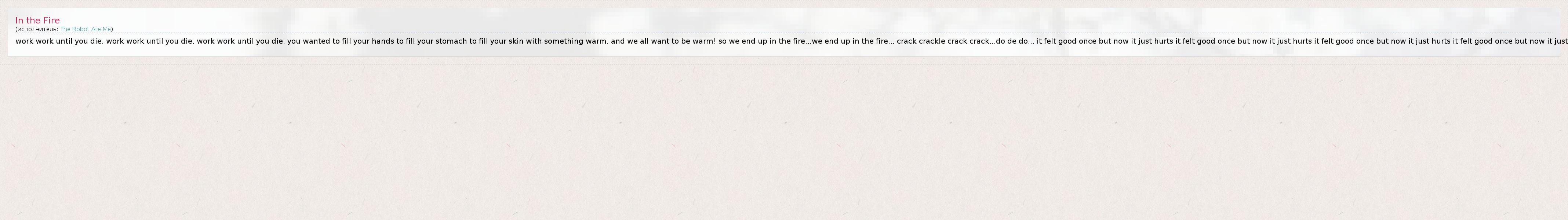 work work until you die. work work until you die. work work until you die. you wanted to fill your hands to fill your stomach to fill your skin with something warm. and we all want to be warm! so we end up in the fire...we end up in the fire... crack crackle crack crack...do de do... it felt good once but now it just hurts it felt good once but now it just hurts it felt good once but now it just hurts it felt good once but now it just