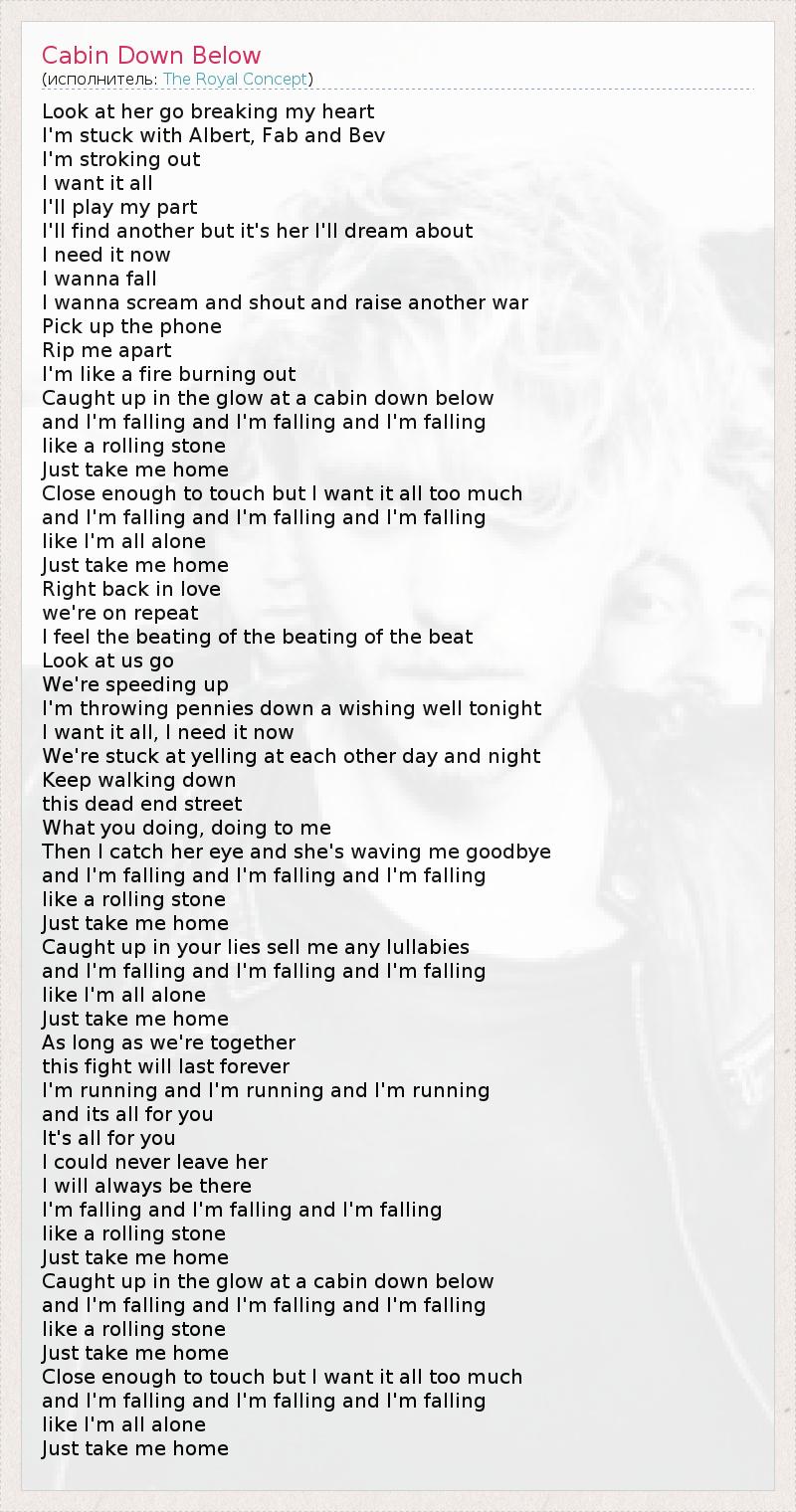 Look at her go breaking my heart I'm stuck with Albert, Fab and Bev I'm stroking out I want it all I'll play my part I'll find another but it's her I'll dream about I need it now I wanna fall I wanna scream and shout and raise another war Pick up the phone Rip me apart I'm like a fire burning out Caught up in the glow at a cabin down below and I'm falling and I'm falling and I'm falling like a rolling stone Just take me home Close enough to touch but I want it all too much and I'm falling and I'm falling and I'm falling like I'm all alone Just take me home Right back in love we're on repeat I feel the beating of the beating of the beat Look at us go We're speeding up I'm throwing pennies down a wishing well tonight I want it all, I need it now We're stuck at yelling at each other day and night Keep walking down this dead end street What you doing, doing to me Then I catch her eye and she's waving me goodbye and I'm falling and I'm falling and I'm falling like a rolling stone Just take me home Caught up in your lies sell me any lullabies and I'm falling and I'm falling and I'm falling like I'm all alone Just take me home As long as we're together this fight will last forever I'm running and I'm running and I'm running and its all for you It's all for you I could never leave her I will always be there I'm falling and I'm falling and I'm falling like a rolling stone Just take me home Caught up in the glow at a cabin down below and I'm falling and I'm falling and I'm falling like a rolling stone Just take me home Close enough to touch but I want it all too much and I'm falling and I'm falling and I'm falling like I'm all alone Just take me home