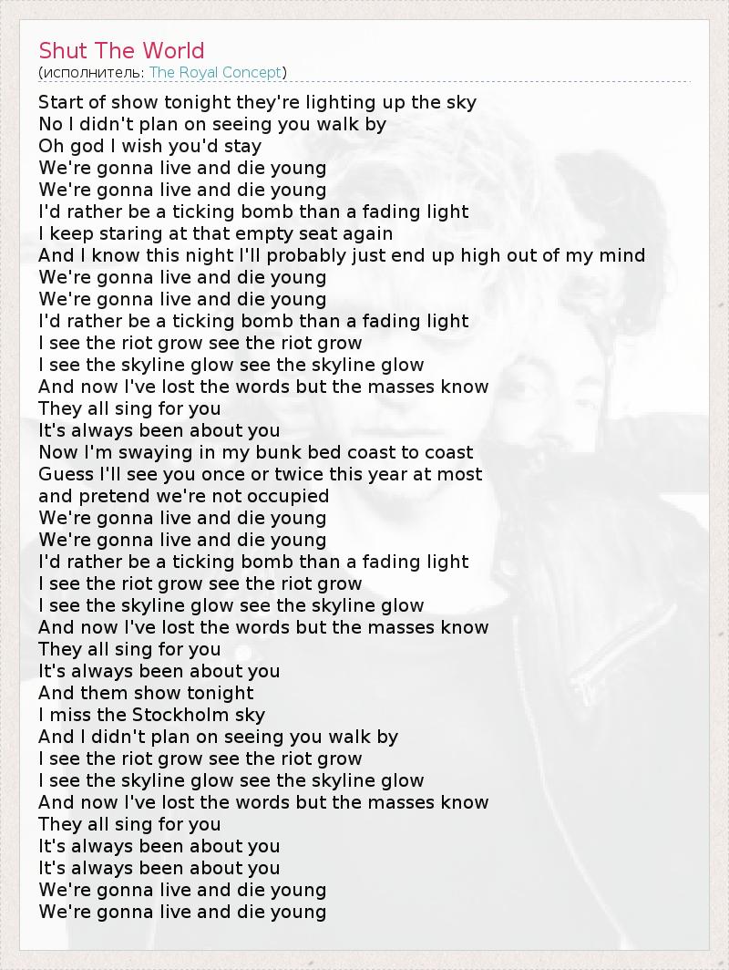 Start of show tonight they're lighting up the sky No I didn't plan on seeing you walk by Oh god I wish you'd stay We're gonna live and die young We're gonna live and die young I'd rather be a ticking bomb than a fading light I keep staring at that empty seat again And I know this night I'll probably just end up high out of my mind We're gonna live and die young We're gonna live and die young I'd rather be a ticking bomb than a fading light I see the riot grow see the riot grow I see the skyline glow see the skyline glow And now I've lost the words but the masses know They all sing for you It's always been about you Now I'm swaying in my bunk bed coast to coast Guess I'll see you once or twice this year at most and pretend we're not occupied We're gonna live and die young We're gonna live and die young I'd rather be a ticking bomb than a fading light I see the riot grow see the riot grow I see the skyline glow see the skyline glow And now I've lost the words but the masses know They all sing for you It's always been about you And them show tonight I miss the Stockholm sky And I didn't plan on seeing you walk by I see the riot grow see the riot grow I see the skyline glow see the skyline glow And now I've lost the words but the masses know They all sing for you It's always been about you It's always been about you We're gonna live and die young We're gonna live and die young