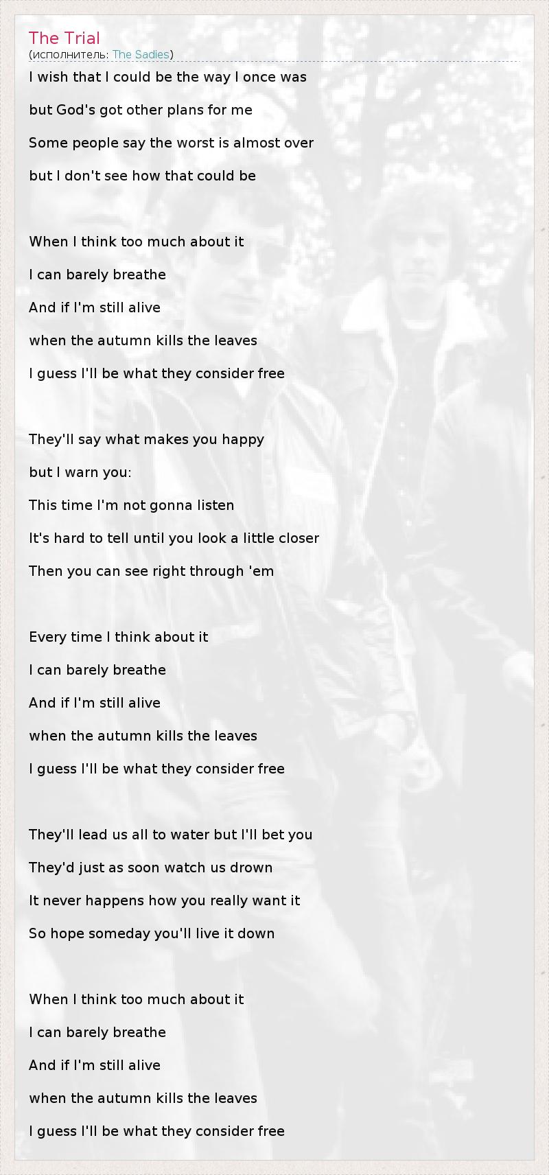 I wish that I could be the way I once was but God's got other plans for me Some people say the worst is almost over but I don't see how that could be When I think too much about it I can barely breathe And if I'm still alive when the autumn kills the leaves I guess I'll be what they consider free They'll say what makes you happy but I warn you: This time I'm not gonna listen It's hard to tell until you look a little closer Then you can see right through 'em Every time I think about it I can barely breathe And if I'm still alive when the autumn kills the leaves I guess I'll be what they consider free They'll lead us all to water but I'll bet you They'd just as soon watch us drown It never happens how you really want it So hope someday you'll live it down When I think too much about it I can barely breathe And if I'm still alive when the autumn kills the leaves I guess I'll be what they consider free