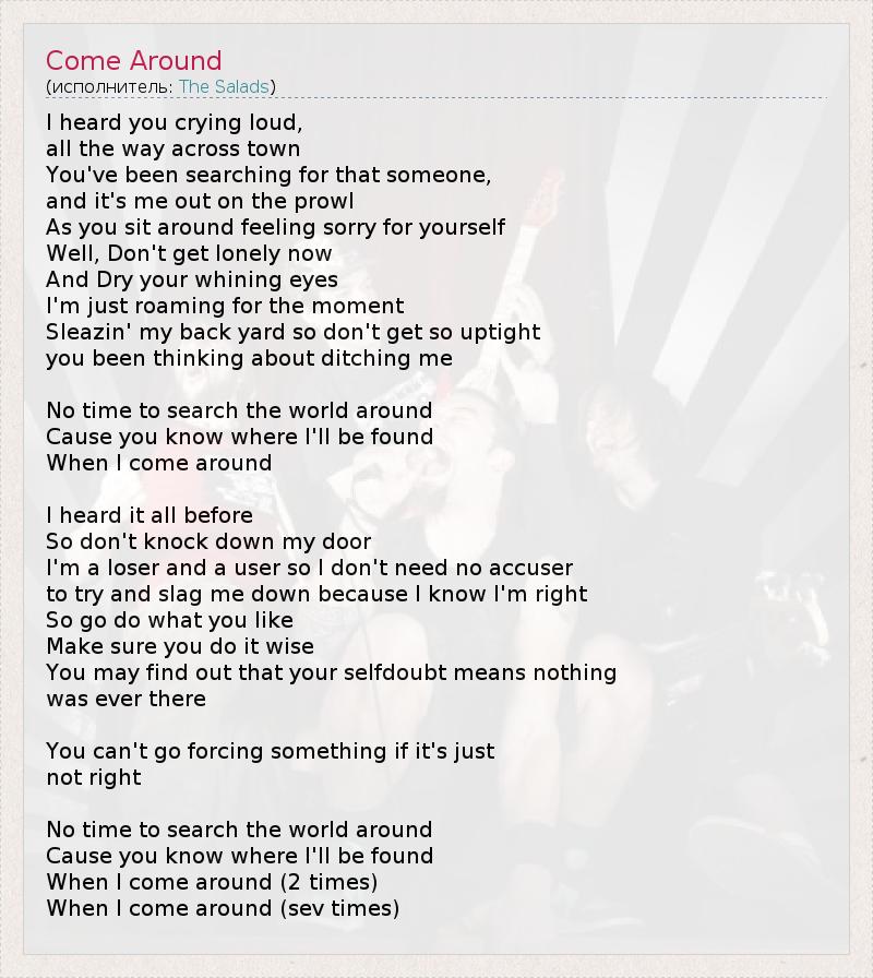 I heard you crying loud, all the way across town You've been searching for that someone, and it's me out on the prowl As you sit around feeling sorry for yourself Well, Don't get lonely now And Dry your whining eyes I'm just roaming for the moment Sleazin' my back yard so don't get so uptight you been thinking about ditching me No time to search the world around Cause you know where I'll be found When I come around I heard it all before So don't knock down my door I'm a loser and a user so I don't need no accuser to try and slag me down because I know I'm right So go do what you like Make sure you do it wise You may find out that your selfdoubt means nothing was ever there You can't go forcing something if it's just not right No time to search the world around Cause you know where I'll be found When I come around (2 times) When I come around (sev times)