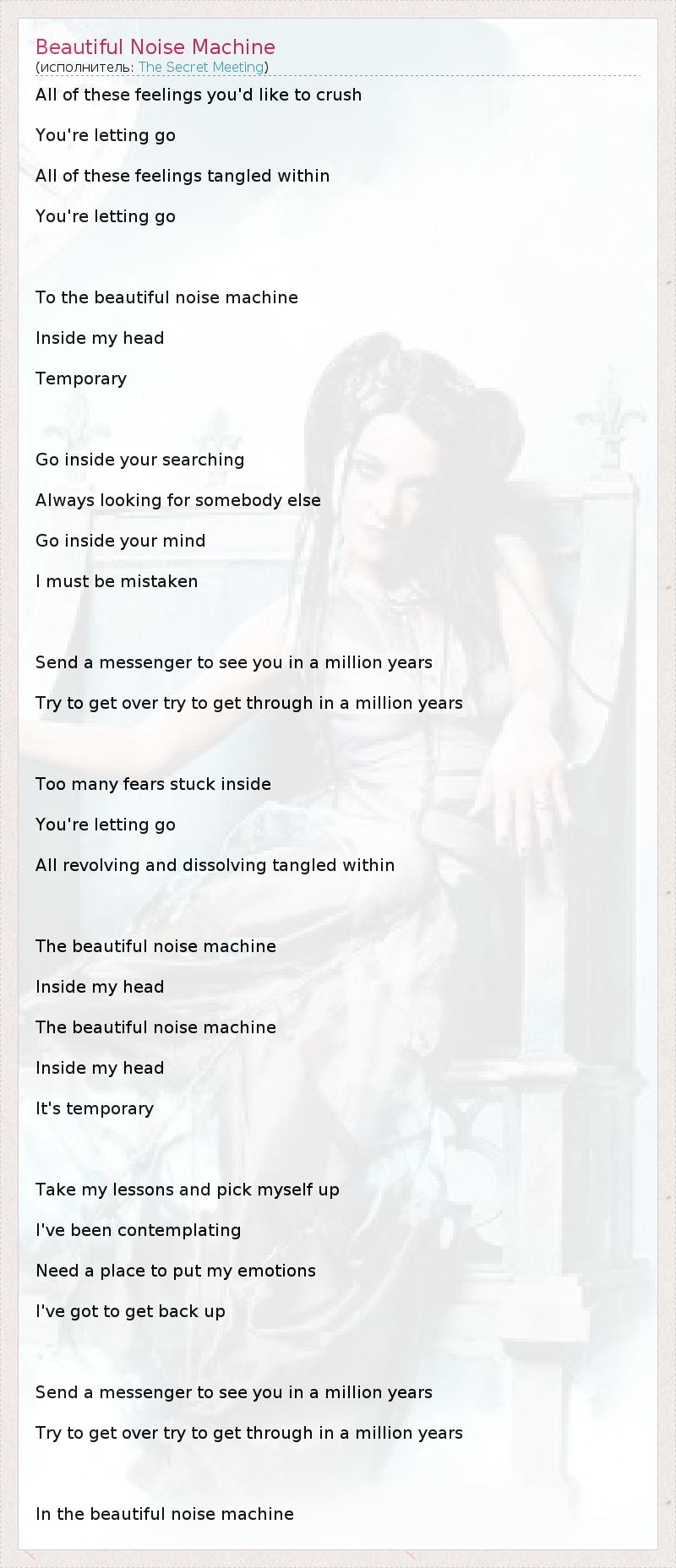 All of these feelings you'd like to crush You're letting go All of these feelings tangled within You're letting go To the beautiful noise machine Inside my head Temporary Go inside your searching Always looking for somebody else Go inside your mind I must be mistaken Send a messenger to see you in a million years Try to get over try to get through in a million years Too many fears stuck inside You're letting go All revolving and dissolving tangled within The beautiful noise machine Inside my head The beautiful noise machine Inside my head It's temporary Take my lessons and pick myself up I've been contemplating Need a place to put my emotions I've got to get back up Send a messenger to see you in a million years Try to get over try to get through in a million years In the beautiful noise machine
